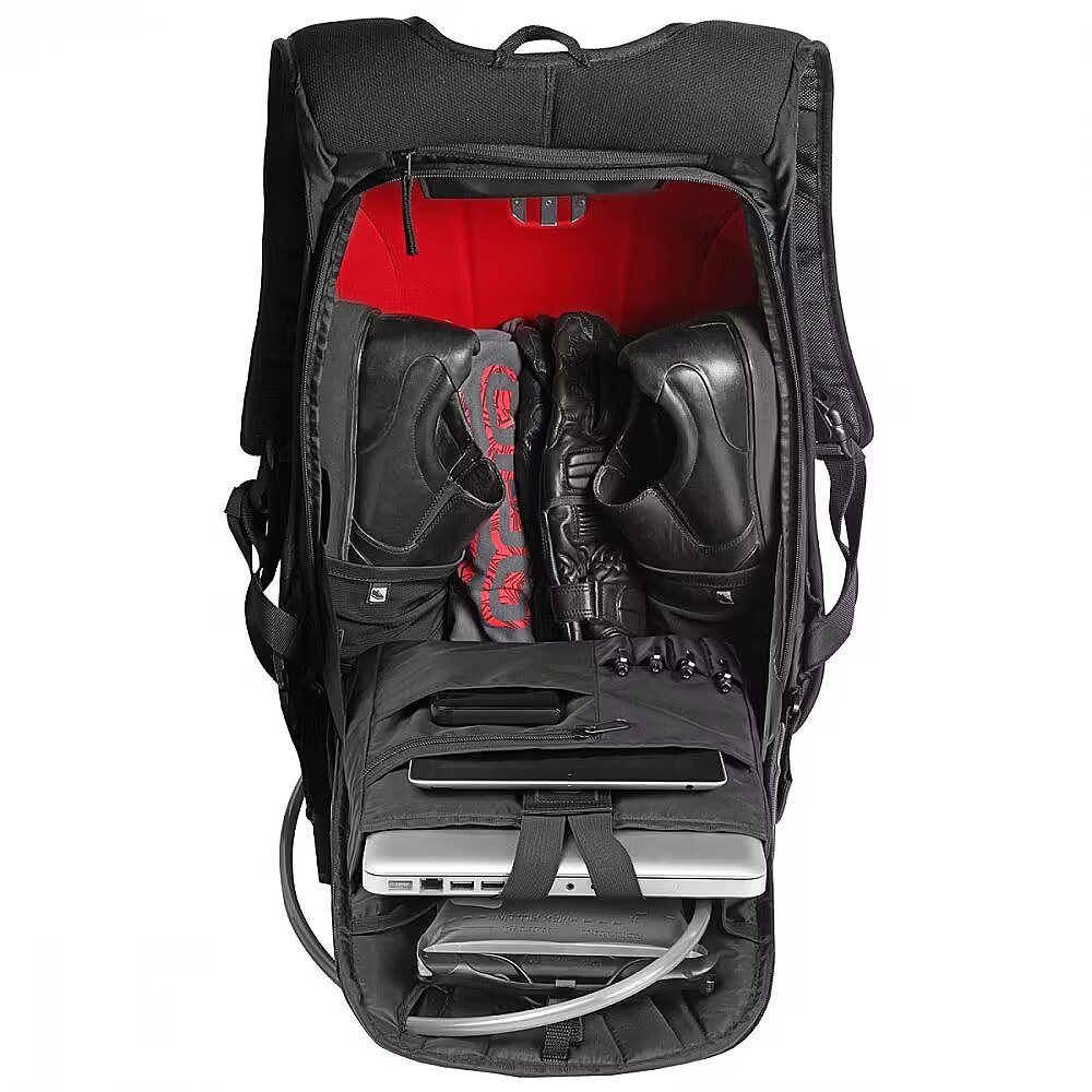 Description - Streamlined single shot molded exterior is water resistant and will not deform from wind shear Shoulder gasket conforms to body and increases aerodynamics Bolstered back foam profile increases air ventilation Soft neck shoulder straps increase comfort while riding and will not scratch helmet exterior 360-degree retro reflective safety piping and logo Removable off center hip belt wont scratch gas tank Zippered fleece lined personal electronics pocket Large main compartment with multiple interior storage compartments Fully featured organizer panel with zippered security pocket Dedicated shoe storage compartments for the commuting professional Ergonomic, padded and fully adjustable riding specific shoulder straps with quick release exit buckle Concealed aerodynamic carry handle. Fully adjustable and removable no slip sternum strap Integrated removable helmet carry strap Interior padded laptop sleeve with elastic closure fits most 15 laptops Padded iPad/tablet/e-reader sleeve Hydration ready