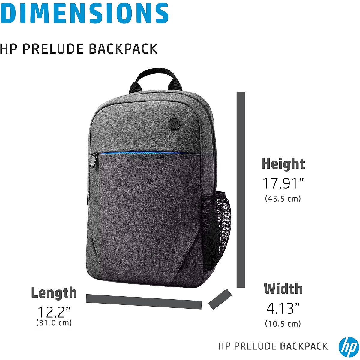 Technical_details - With the durable HP 15.6 Prelude backpack you can transport your notebook safely and have your hands free. The elegant gray interior of the backpack sets a colorful accent. Thanks to the zip on the top, a special compartment for notebooks with a diagonal of up to 39.6 cm (15.6") and easy-access internal and external pockets for cables, adapters, pens, telephones, you can keep track of things. Padded straps ensure comfort. Item no.: 1774925 Backpack type Color grey/black EAN 0195122282769 Manufacturer no. 1E7D6AA Suitable for notebooks with a screen diagonal of up to 39.6 cm (15.6") Areas of application: work, lifestyle, university Volume 10.8 liters Carrying style type shoulder strap Notebook compartment diagonal 39.6 cm (15.6 ") Closure: Zipper Compartments type utensil compartment Dimensions external width: 286 mm x height: 410 mm x depth: 90 mm Weight 490 grams