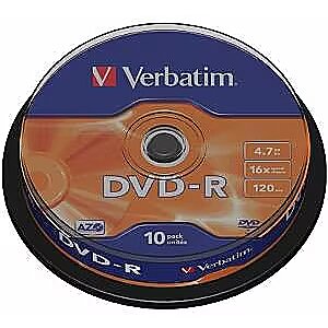Technical_details - Verbatim DVDR/RW uses MKM/Verbatim's technology which ensures any recording to be of a superior quality. Mitsubishi Chemical's R&D combined with its strong coorperation with drive manufacturers ensures the broad compatibility of Verbatim's discs making them ideal for sharing computer data, home videos, photos and music. Medium Type DVD-R Number of Media 10 pieces Capacity Run-Time 120 minute(s) Write Speed 16 Quantity (compartments) Packaging Spindel Features One-Sided Single-Layered DVD General