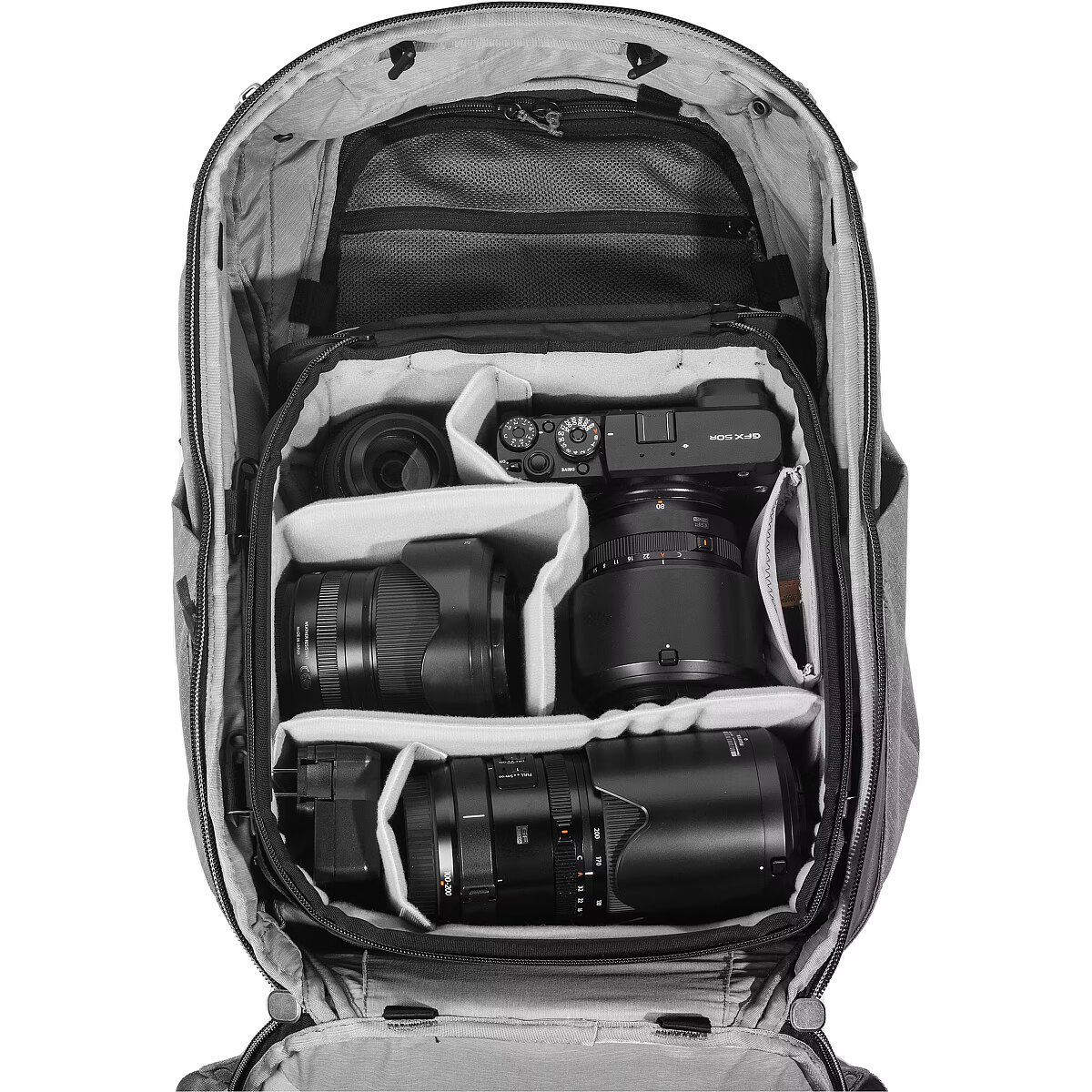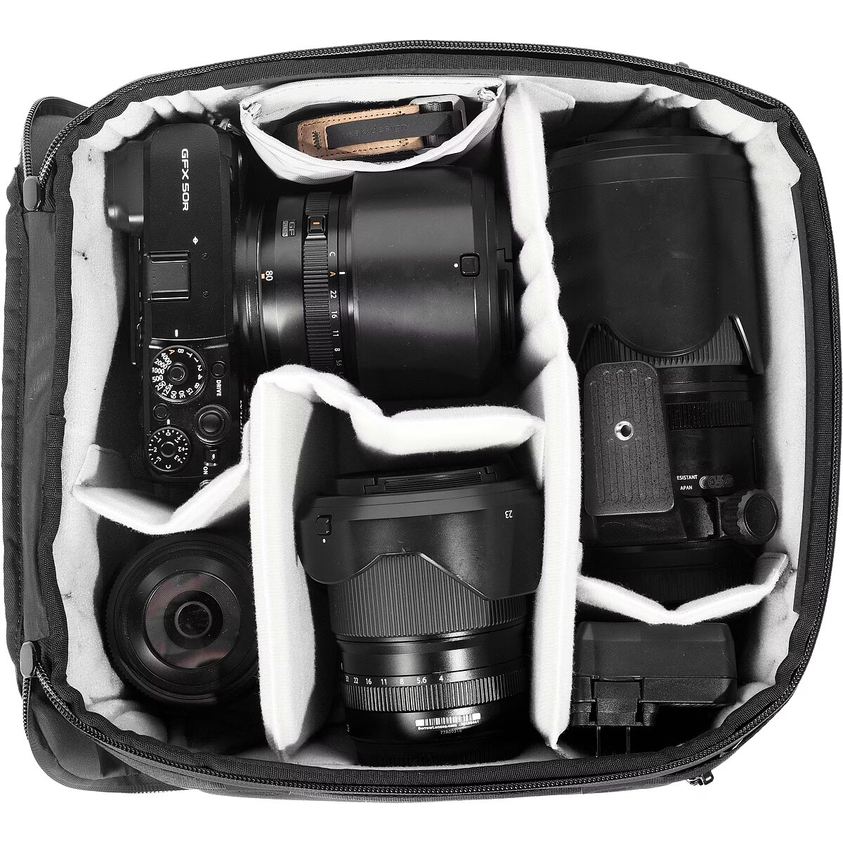 FlexFold vaheseinad võimaldavad kohandatavat organiseerimist ja kaitset. Maksimaalse mahutavuse saavutamiseks aseta esemed vertikaalselt virna. Ujuv tasku on mõeldud objektiivikorgi, filtri ja muude väikeste esemete jaoks. Mugav kaasaskandmine
