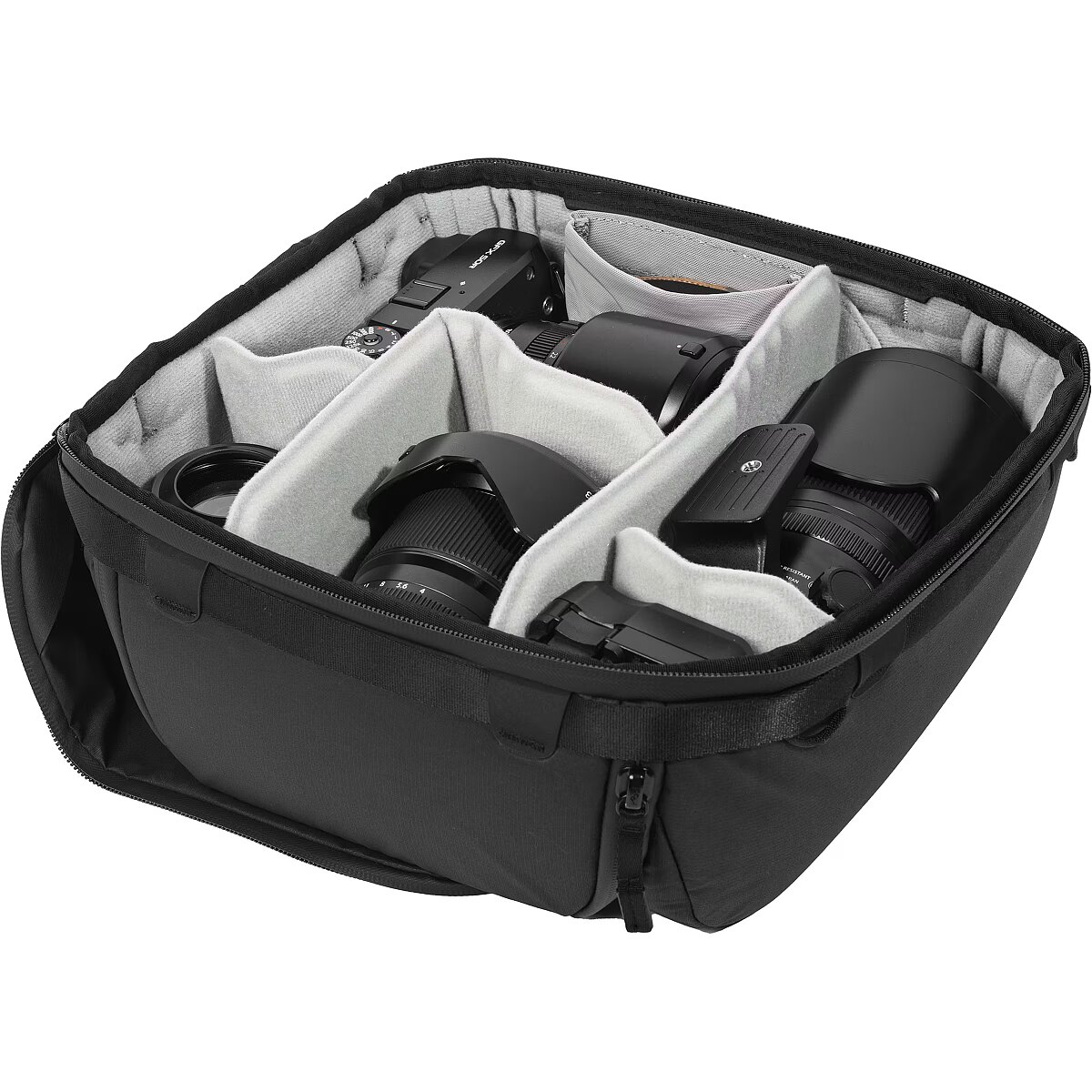 FlexFold dividers enable customizable organization and protection. Vertically stack items for maximal capacity. Floating pocket stores lens caps, filters, and other small items. Convenient carry
