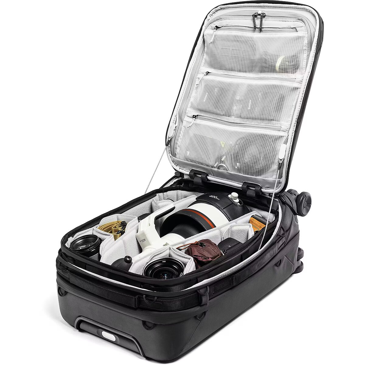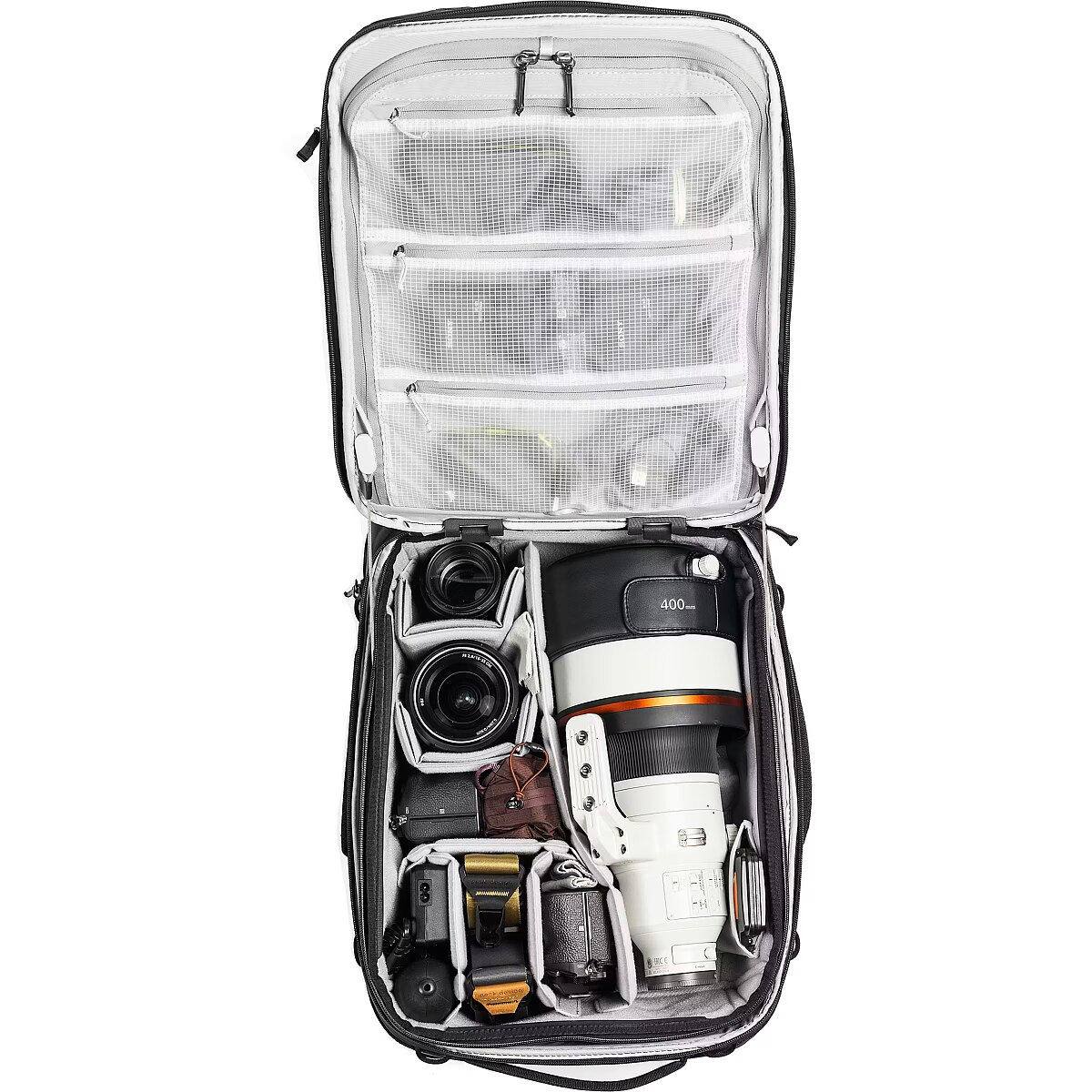 FlexFold dividers enable customizable organization and protection. Vertically stack items for maximal capacity. Floating pocket stores lens caps, filters, and other small items. Convenient carry