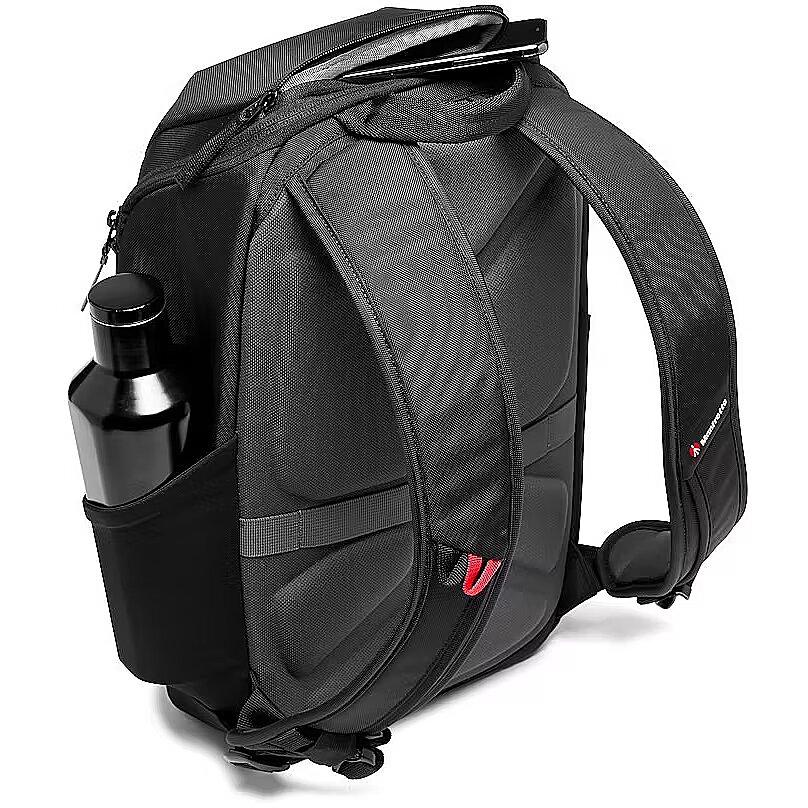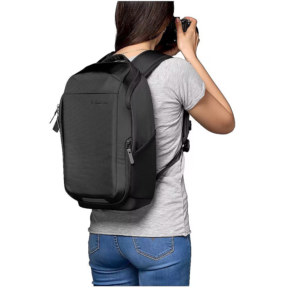 The padded top compartment is designed for CSCs (like a Sony A6000 series), and can fit additional 2-3 lenses depending on size. The dividers in the main compartment to keep things neat and perfectly arranged. The padded camera compartment features the brand-new Manfrotto M-Guard™ Protection System that is made of special high-density EVA foam. This provides exceptional shock absorbing response with a super slim profile. The customizable folding patterns allow maximum versatility to fully protect camera gear while maximizing the use of space. A top load design means that getting hold of your kit is easier and quicker than ever. The bag also has a dedicated laptop compartment which is a perfect fit for a 14 inch laptop. In the lower compartment, you can slot in all your personal belongings and access them through a separate zipper. This clever design helps you get your hands on what you need without taking the bag off entirely. You can carry your small tripod such as Joby Gorillapod 3K with the strong side strap, and extra elastic pockets give you the freedom to carry a water bottle, an umbrella, or any other must-have you might need. All external fabric are treated making the bag water repellant which can be further reinforced by the supplied raincover in case of adverse weather conditions. Practical and compact backpack for cameras and personal items For crop-sensor mirrorless camera + 2-3 lenses plus accessories Quick gear access with top load design; Personal items below Dedicated 14" padded laptop compartment padded for protection Side tripod attachment for compact tripods like Joby Gorillapod