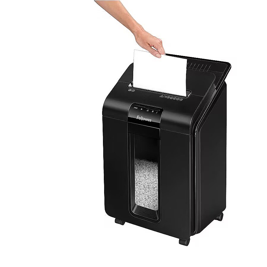 Description - AutoMax™ 100M Mini-Cut Shredder 100-sheet auto feed and 10-sheet manual feed shredding capacity (70gsm paper) 4x10mm Mini-Cut (Security Level P-4) - Shreds each A4 sheet into over 1000 particles. Around 4x more secure than standard cross-cut Shreds non-stop for up to 15 minutes. Ideal for regular use Auto Reverse, Silentshred and Sleep Mode features ensure safe, disruption-free shredding Large, 23 litre pull-out bin and extra-small particle size give a capacity of at least 175 sheets Accepts staples, credit cards and paper clips through the manual feed slot