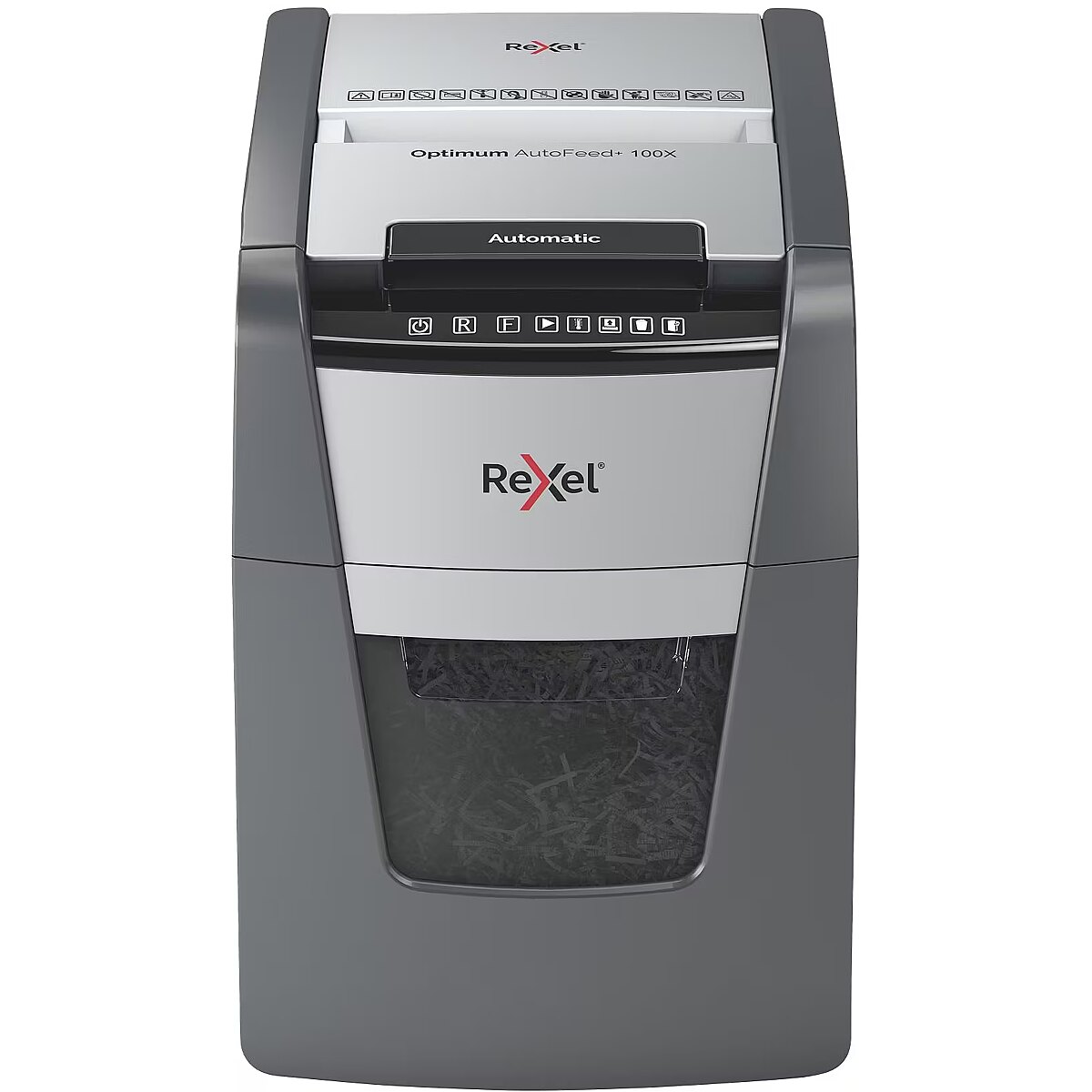 productName - Rexel AutoFeed+ 100X automatic shredder, P-4, cuts confetti cut (4x28mm), 100 sheets, 34 litre bin