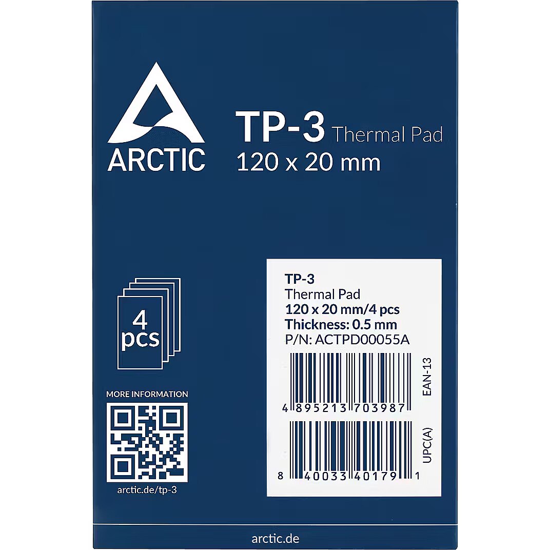 LongSummaryDescription - ARCTIC TP-3 Premium Performance Thermal Pad 120 x 20 mm, 0.5 mm. Type: Thermal pad, Product colour: Blue. Width: 120 mm, Depth: 20 mm, Height: 0.5 mm. Quantity per pack: 4 pc(s), Package width: 95 mm, Package depth: 140 mm