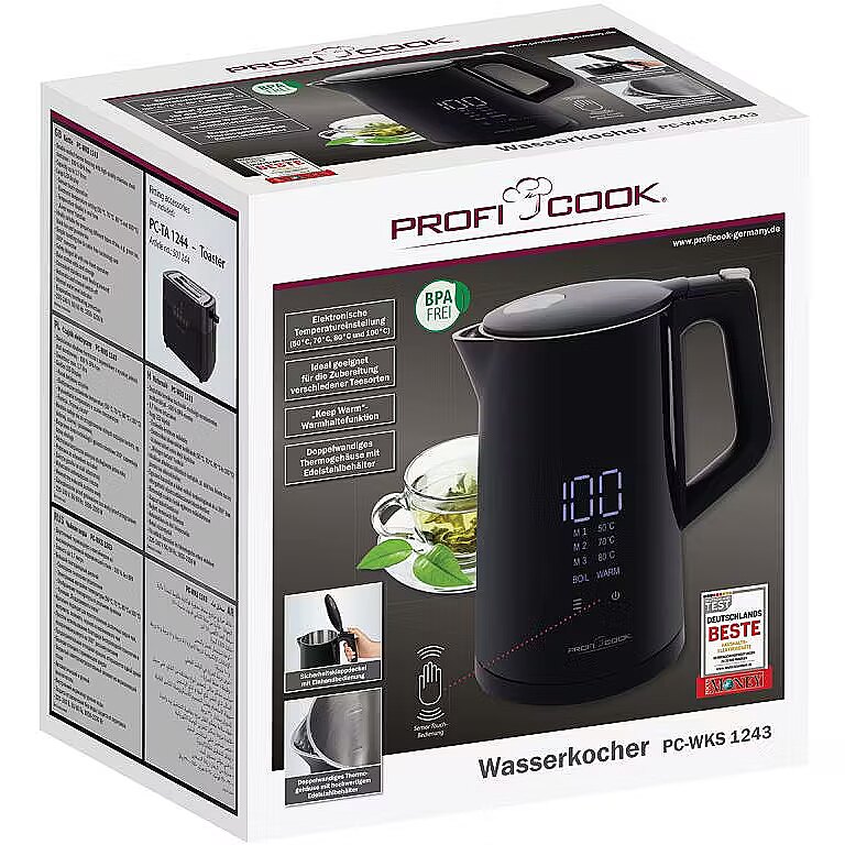 Category_1 - Appliances Category_2 - Small Electronics - Water Boilers dimensionalWeight - 3181 EAN_code - 4006160112436 Ergonomics - 360° rotational base - Yes Ergonomics - Cordless - Yes Ergonomics - Display - LED Features - Adjustable thermostat - Yes Features - Control type - Touch Features - Housing material - Stainless steel Features - Keep warm function - Yes Features - Number of temperature settings - 4 Features - Overheat protection - Yes Features - Product colour - Black Features - Water level indicator - Yes Features - Water tank capacity - 1.7 L Manufacturer - Proficook Manufacturer_code - 501243 Name - ProfiCook PC-WKS 1243, kettle (black) Power - AC input frequency - 50 - 60 Hz Power - AC input voltage - 220 - 240 V Power - Power - 2200 W Power - Power source - AC producerCode - PC-WKS 1243 productName - ProfiCook PC-WKS 1243 electric kettle 1.7 L 2200 W Black productSize - Normal sizeX - 188 sizeY - 323 sizeZ - 262 warrantyLength - 36 warrantyType - G Weight - 1,48 weight - 1470