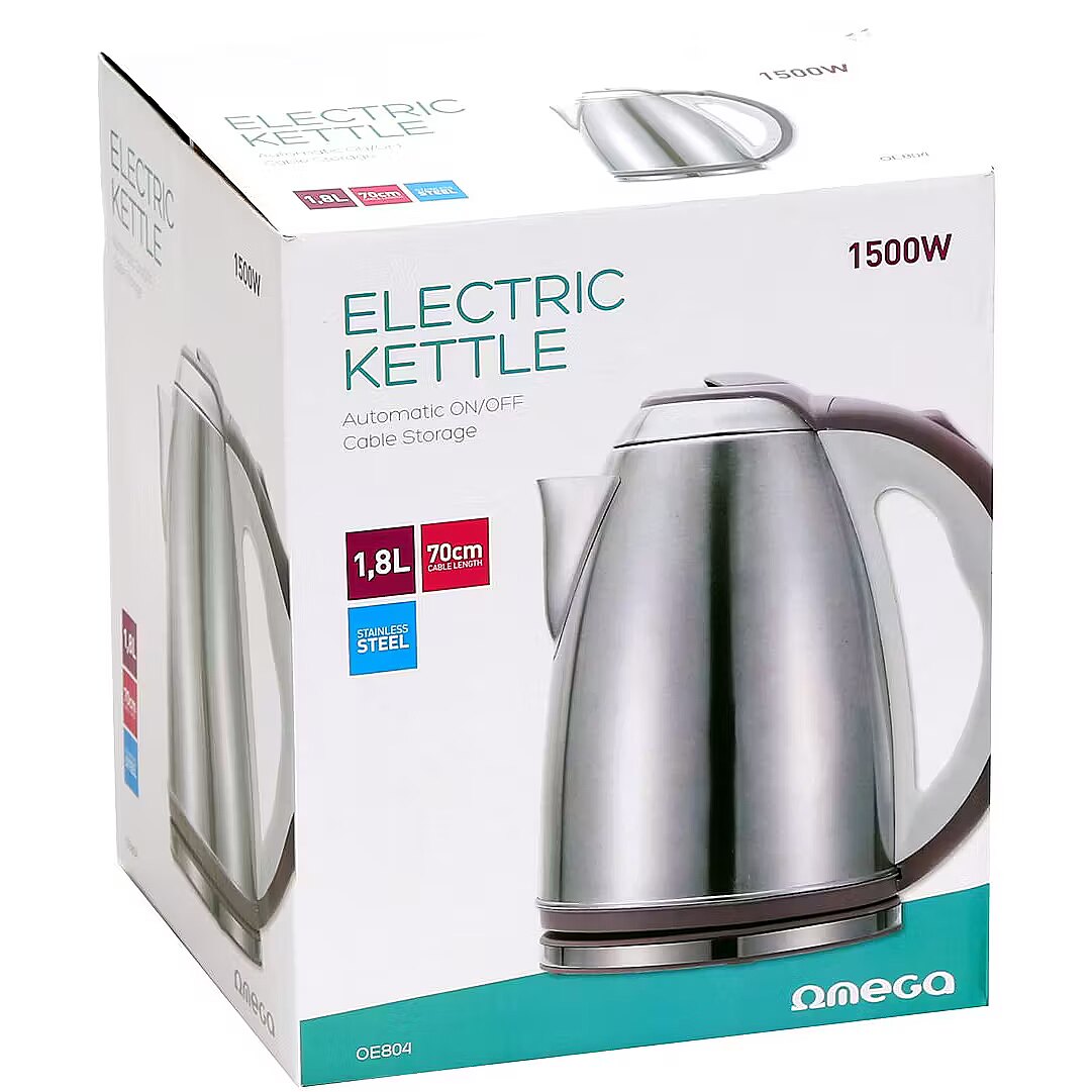 description_en - Omega OEK801 is an electric kettle with a comfortable handle and swivel base. The kettle switches off automatically after boiling water, and it has a protection system for accidental switching on and operation without water. Swivel base Material: stainless steel and plastic Power cord length: 70 cm Capacity: 1.8 liters Power: 1500 W