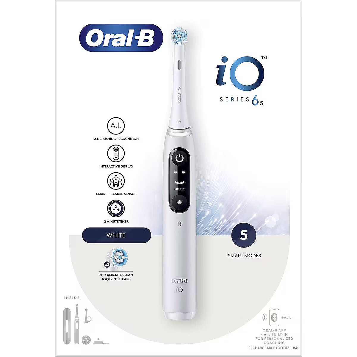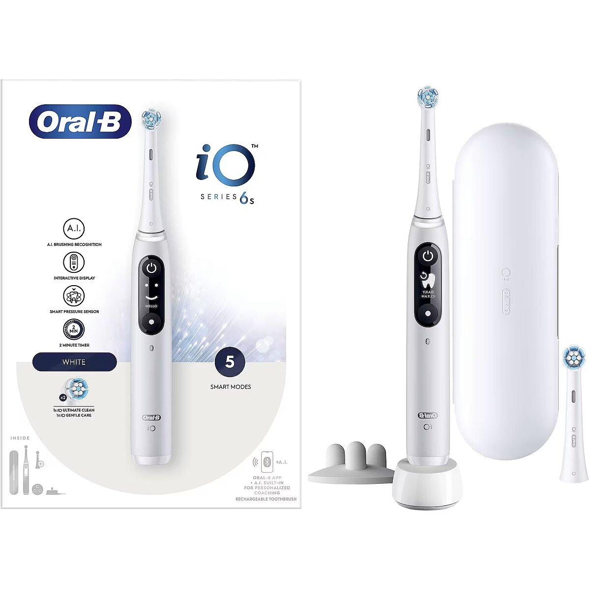 LongSummaryDescription - Oral-B iO 6. Purpose: Adult, Toothbrush type: Vibrating toothbrush, Teeth brushing modes: Daily care, Deep clean, Gum care, Sensitive, Whitening. Power source: Battery, Battery type: Built-in battery. Package type: Box. Number of handles included: 1 pc(s), Number of brush heads included: 2 pc(s)