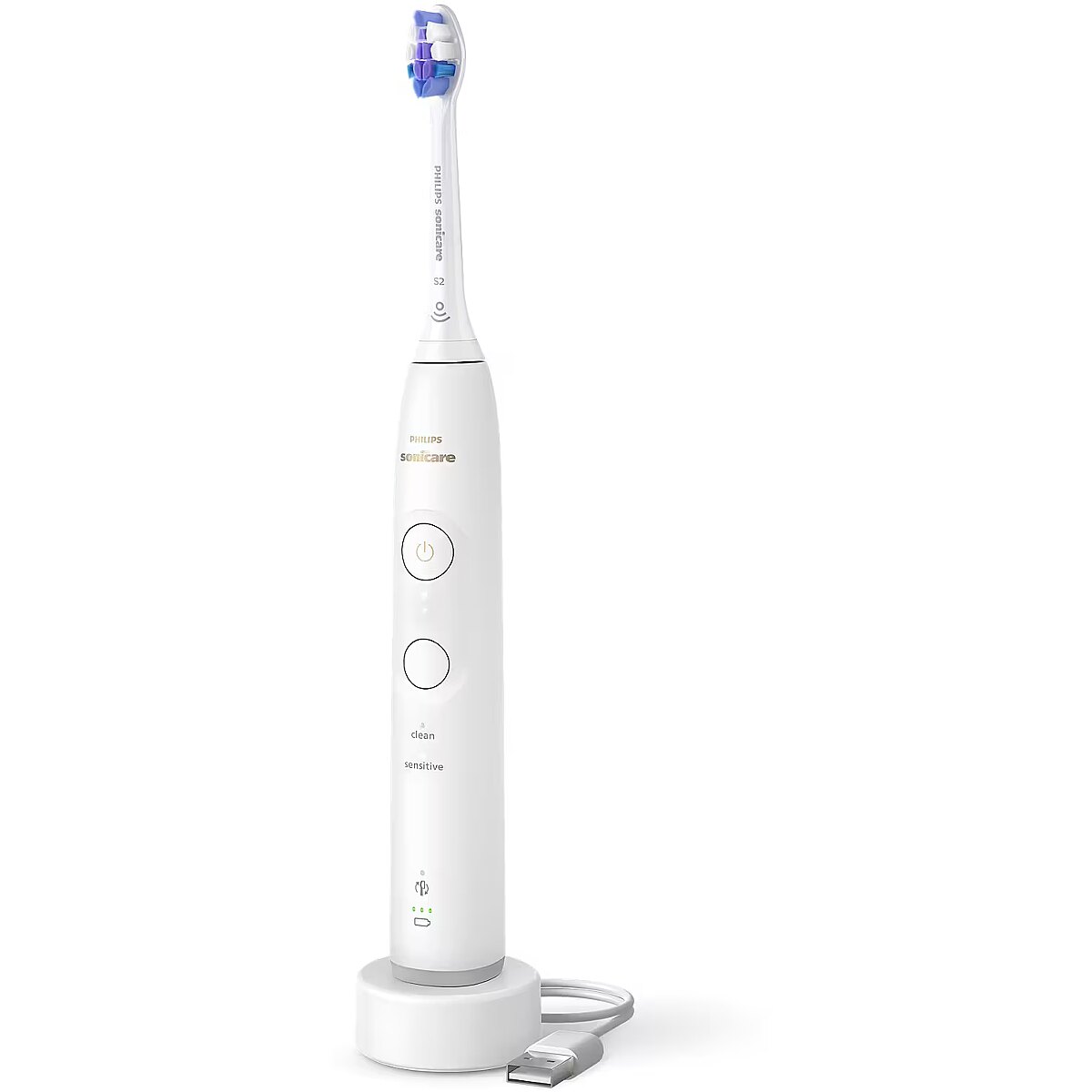 Description - Advanced care for sensitive teeth and gums Gently removes 10 x more plaque* The Philips Sonicare Series 6100 Electric Toothbrush features Next-Generation Sonicare technology, a dedicated Sensitive mode, S2 Sensitive brush head and low intensity. Plus, a pressure alert for when you brush too hard. Comes with a travel case.Modes and IntensitiesSmarTimer and BrushPacerReplacement reminder21-day battery lifeNext-Generation Sonicare TechnologyExtra care for sensitive teethVisual pressure sensor- in hard-to-reach areas vs. a manual toothbrush in 6 weeks.