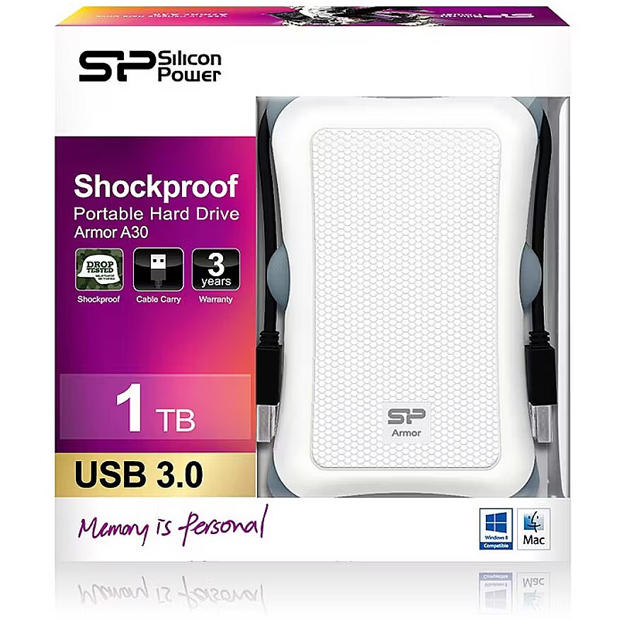 With super-speed USB 3.2 Gen 1 interface, the Armor A30 delivers swift read and write speeds. Cut the time needed to edit or transfer large files, including HD graphics and videos, to get the job done faster so you can move on to the next project. SuperSpeed USB 3.2 Gen 1 compliant and backwards compatible with USB 2.0 Meet the U.S. military drop-test standards MIL-STD 810G Method 516.6 Procedure IV (transit drop test), including specific height free fall test (122cm). Cable carry design Advanced internal hard drive suspension system Easy Plug in and use - no external adapter required SP Widget free download software, providing 7 major back-up and security functions