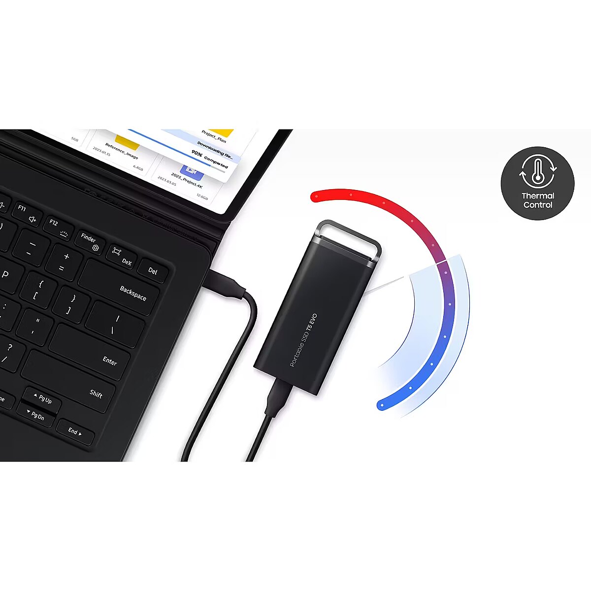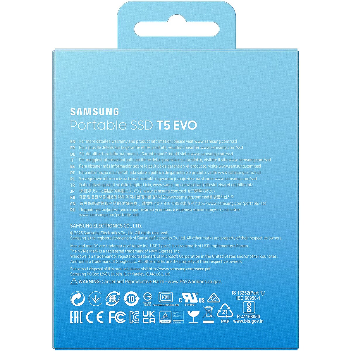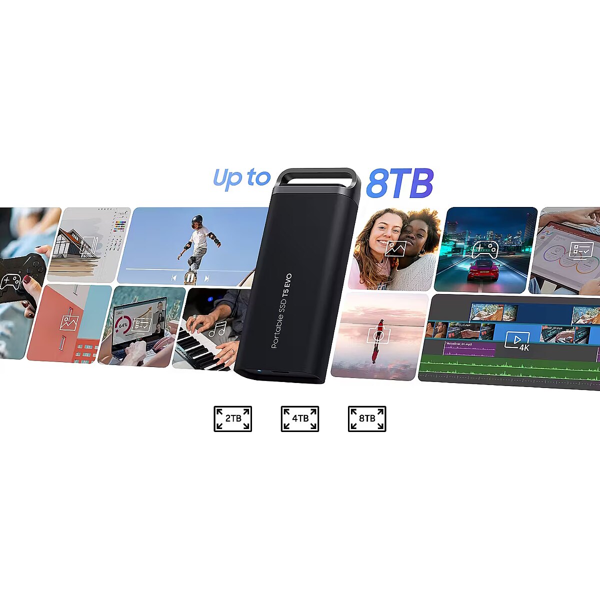 Description - SAMSUNG T5 EVO Portable SSD USB 3.2 Gen 1 + 0% Finance available, view options + Up to 3.8x faster than an external HDD with read & write speeds of up to 460MB/s. + Available in various storage capacities up to 8TB. + Ergonomic design with a rubberised surface and metal ring for ease of use. + Peace of mind with up to 2 meters drop resistance and a 3-year limited warranty. + Compatible with Windows, macOS, Android phones and tablets and gaming consoles. + Includes USB Type-C to C cable. Versatility at your fingertips Life offers you many opportunities. With the versatile T5 EVO Portable SSD, you can stay ahead of the curve when working, creating, learning, playing, or looking for inspiration. It offers compelling performance, data protection. Full speed ahead With sequential read, write speeds of up to 460 MB/s, the T5 EVO can handle large file transfers with faster and sustained performance compared to external hard drives. It’s engineered to keep you performing at all times. Store large files With storage capacities, the T5 EVO is suitable for a wide range of applications. Whether you're working, creating, studying, gaming, or backing up, the Portable SSD has the right size for your needs. Thermal management Safe to use without overheating. The advanced temperature management of the T5 EVO uses Dynamic Thermal Guard technology. This ensures that the T5 EVO does not get uncomfortably hot and maintains its optimum operating temperature even under heavy use. Because your safety is our top priority. Extensive compatibility Whichever device you're using, the T5 EVO makes the connection. It works with Macs, PCs, laptops, and Android™ smartphones and tablets. It is also compatible with game consoles. Decide when and where you want to use your T5 EVO.