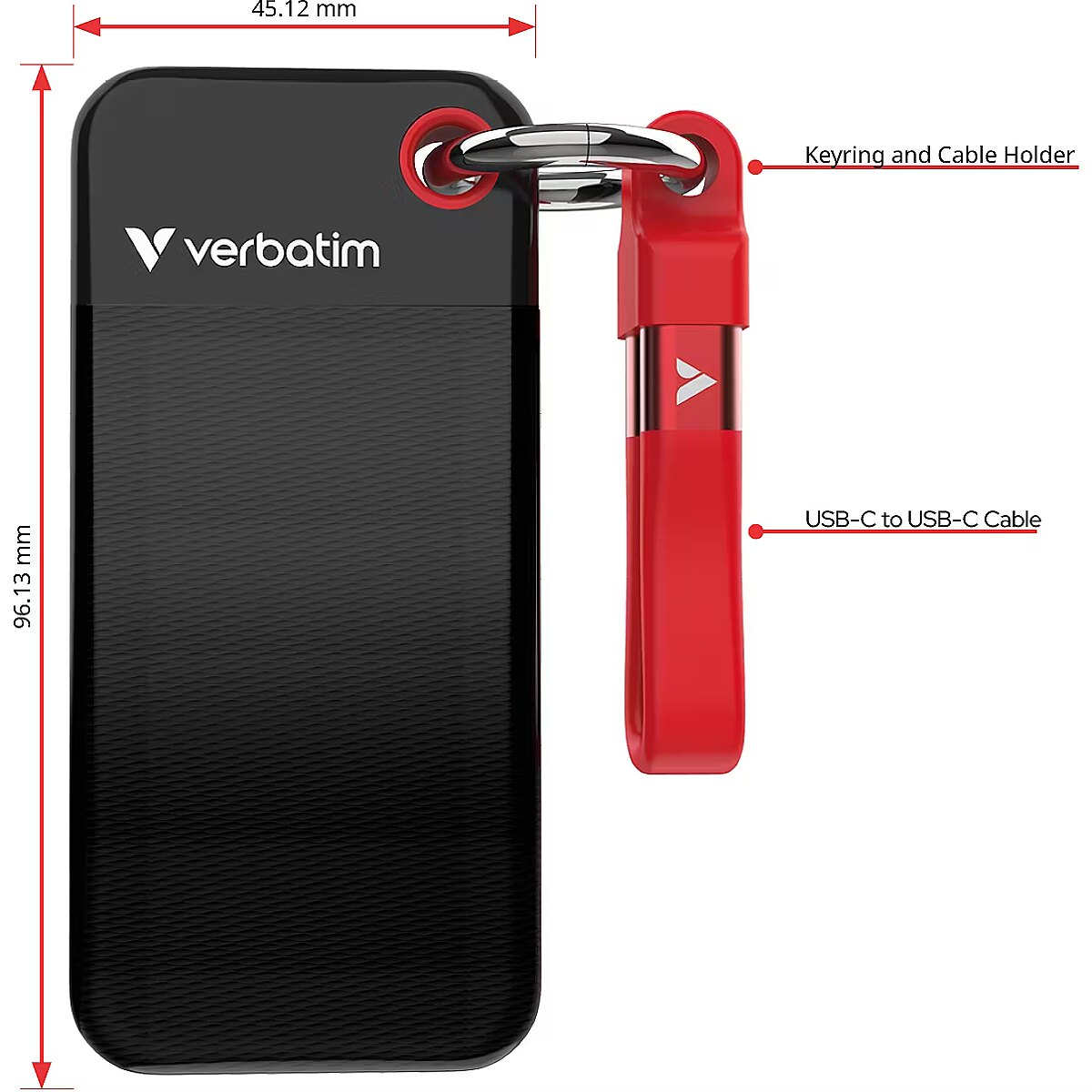 LongDesc - Compact PowerhouseDesigned for ultimate portability, the Pocket SSD from Verbatim is ultra-lightweight at 58 grams and at just under 97mm in length, small enough to slip into your back pocket.Lightning Fast PerformanceCompatible with both PC and Mac operating systems, the SSD interface is USB 3.2 Gen 2 for super-fast data transfer speeds of up to 10Gbps. The SSD handles large data transfers quickly, ideal for high res video editing, managing large amounts of data or maximising gaming performance. The Pocket SSD comes with a USB-C® to USB-C cable in a handy cable holder, for seamless connectivity in a travel-sized package.Rock-Solid and SecureThe Pocket SSD uses flash memory storage, offering fast speeds and high performance. SSDs have no moving parts which make them more reliable, completely silent, and use less power!Keyring and Cable HolderThe included keyring keeps your SSD securely attached to a belt loop or backpack. Even a set of keys! The thoughtfully design cable holder keeps the USB-C® Cable neatly stored and tangle-free. Perfect for travel.Nero Backup softwareFor added security, Nero Backup software is provided to help you back up all your files, folders, and drives from your laptop or PC whenever you want. It also allows you to schedule an auto back up to a set time and day to ensure that it gets done regularly! Nero Backup Software is only compatible with Windows OS.*Actual transfer speeds depend on file size, computer performance and operating system.