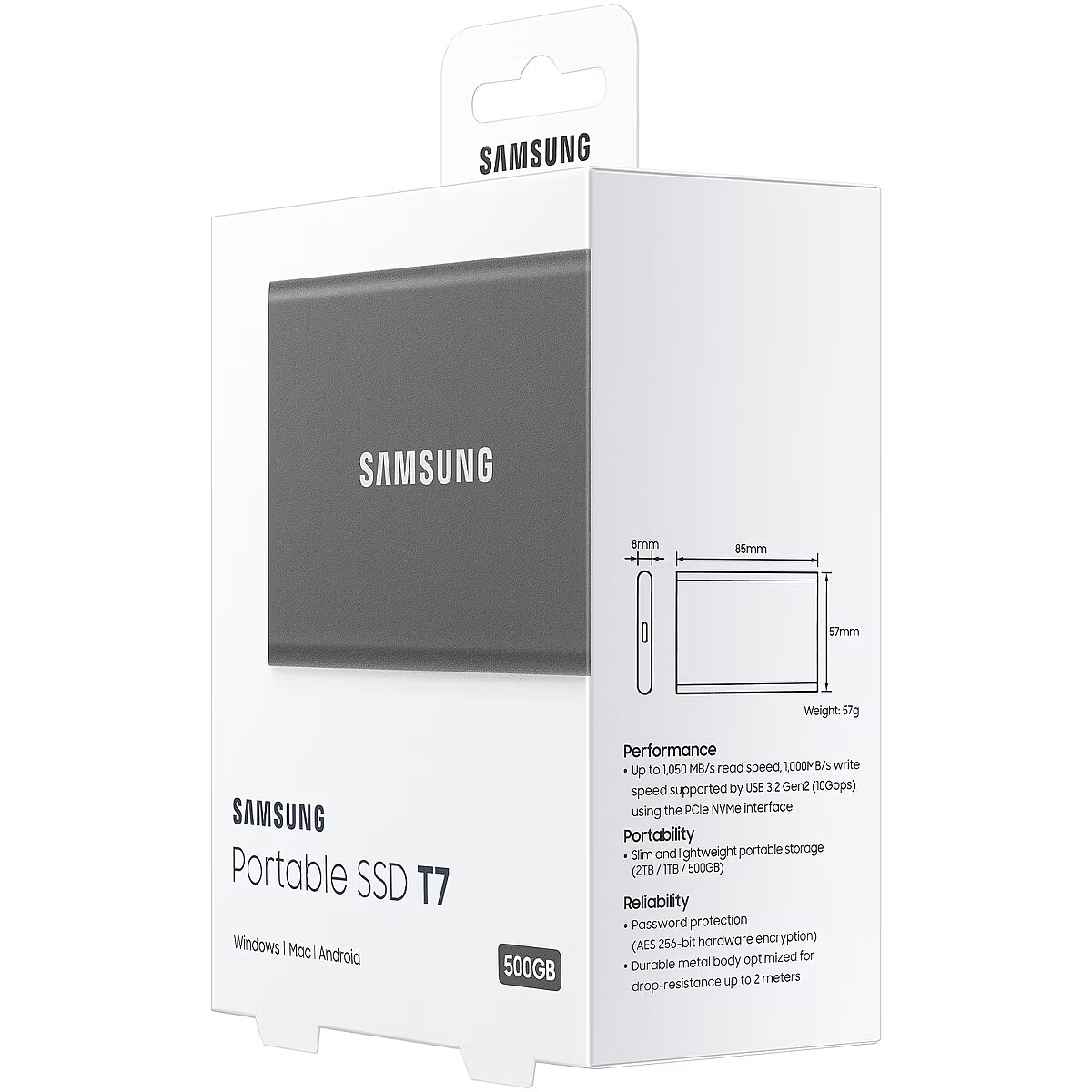 LongDesc - Transfer in a flashFeaturing sequential read/write speeds of up to 1,050 MB/s and 1,000 MB/s, the T7 can transfer massive files in mere seconds via its USB 3.2 Gen 2 interface to give your workflow a much-needed boost.Compact design with colossal capacityStore it all on a credit card-size drive with capacity from 1TB to 4TB in choice of blue or grey.Compatible with multiple devicesBundled with USB Type C-to-C and Type C-to-A cables for added convenience, the T7 minimises disruption, letting users switch seamlessly between Windows®, macOS®, smartphones, tablets or game consoles.Capture longer, save instantlyProlong your smartphone filmmaking with T7's excellent power efficiency. Capture and store 4K smartphone filming data simultaneously with T7. Enable instant editing with effortless T7 connection to your laptop or PC.Sophisticated thermal solutionUse T7 without worrying about overheating. The T7's advanced thermal solution uses the Dynamic Thermal Guard to withstand and control heat, so the compact SSD stays at an optimal temperature even at fast speeds.Built strong and secureThe T7 can be secured with an AES 256-bit encrypted password and is encased in a sturdy metal body that keeps data intact from falls of up to 2 meters. The T7 is confidently backed by a 3-year limited warranty.Samsung Magician softwareUnlock the full power of T7 with Samsung Magician software - a user-friendly suite of optimisation tools that facilitate the best portable SSD performance. Protect valuable data, monitor drive health, and get the latest firmware updates.Bringing innovations to lifeFor decades, Samsungs NAND flash memory has powered groundbreaking technologies that have changed every part of our daily lives. This NAND flash technology also powers our consumer SSDs, making room for the next big push of innovation.Lightning-fast transfer speedsWith up to 1,050 MB/s transfer speed, the T7 puts you full speed ahead at work or play.Extensive compatibilityFreely switch between devices during your workflow without disruption.Sleek and compact styleEffortlessly transfer vast data with the light and compact T7.