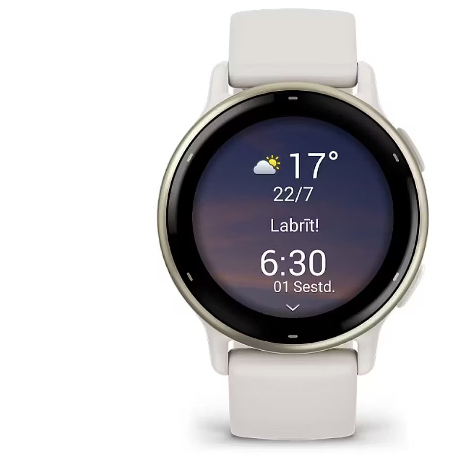 description_lv - Garmin Vivoactive 5 viedpulkstenis (010-02862-11) krēmbaltā krāsā ir elegants un funkcionāls viedpulkstenis, kas apvieno stilu ar visaptverošām veselības un fitnesa uzraudzības iespējām. Tā gaišais tonis piešķir tam smalku un mūsdienīgu izskatu, padarot to par lielisku aksesuāru ikdienai.