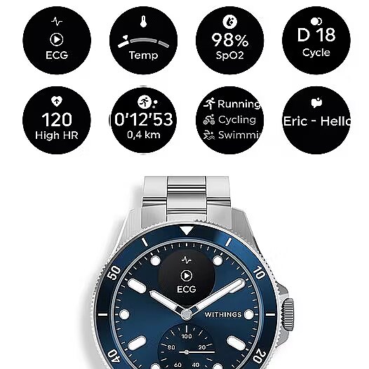 : Attālums, Kaloriju skaitītājs, Miega uzraudzība, Sieviešu menstruālais cikls, Sirdsdarbības ritms, Skābeļa daudzums asinīs, Soļu skaits, Stresa līmeņa uzraudzība, Treniņu režīmi