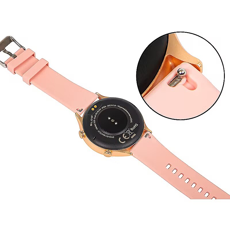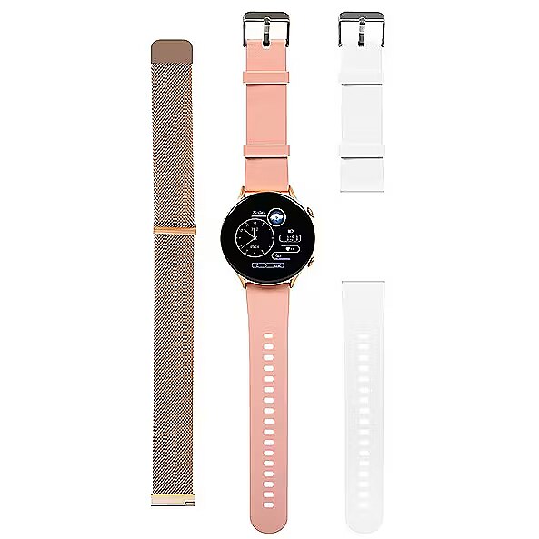 Accessories included - Zegarek DAMSKI Smartwatch zapakowany w ładne pudełko Pasek gumowy różowy, biały Bransoleta ze stali nierdzewnej Kabelek usb do ładowania Instrukcja obsługi w języku polskim i angielskim