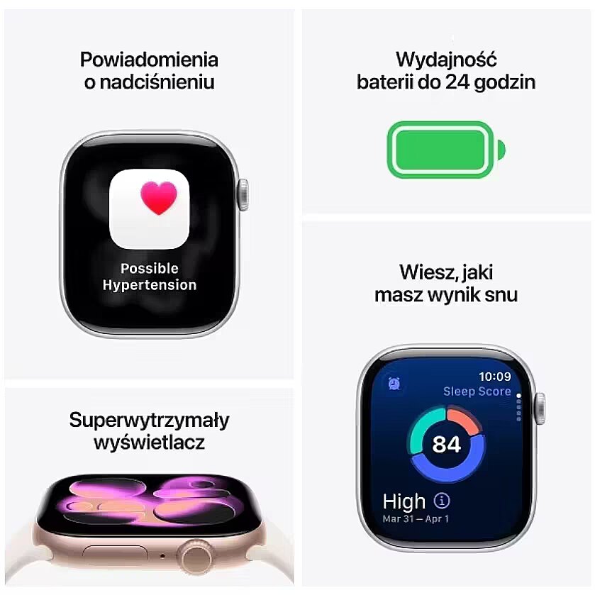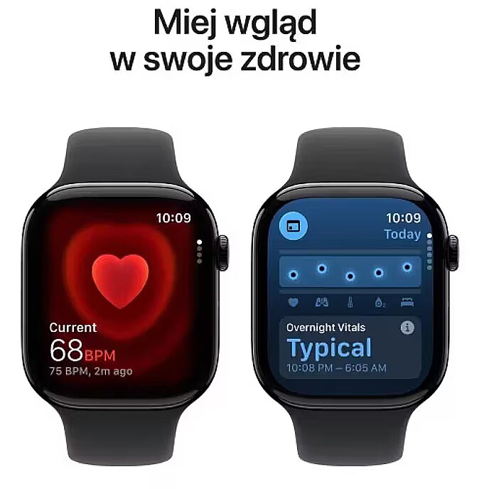 Im więcej wiesz o swoim zdrowiu, tym skuteczniej możesz się o nie zatroszczyć. Z Apple Watch Series 11 masz jego pełniejszy obraz. Dzięki apkom takim jak EKG i Parametry życiowe możesz na bieżąco monitorować swój stan. A przełomowa funkcja Powiadomienia o nadciśnieniu to nieocenione wsparcie w profilaktyce zdrowego serca. Powiadomienia o nadciśnieniu Nadciśnienie dotyka ponad 1,3 miliarda osób na całym świecie i stanowi główną przyczynę zawału serca, udaru czy chorób nerek. Nie daje objawów, więc często nie zostaje zdiagnozowane. Bywa przeoczone nawet podczas wizyty lekarskiej, ponieważ w jej trakcie dokonuje się zwykle tylko jednego pomiaru ciśnienia. Aby otrzymywać powiadomienia o nadciśnieniu, wystarczy nosić zegarek przez minimum 30 dni. Series 11 da Ci znać, jeśli zauważy symptomy możliwego nadciśnienia. Jak to działa? Czujnik optyczny gromadzi dane, które następnie analizowane są przez algorytm pod kątem ewentualnego nadciśnienia. W tym celu sprawdza się reakcje naczyń krwionośnych na bicie serca przez okres 30 dni. Zupełnie nowe spojrzenie. Twarde naukowe podstawy. Powiadomienia o nadciśnieniu to przełomowa funkcja, która została stworzona w oparciu o zaawansowane metody uczenia maszynowego oraz serię badań naukowych. Wzięło w nich udział ponad 100 000 osób. Ostatnim krokiem było sprawdzenie funkcji podczas badań klinicznych. Twój dziennik pomiarów ciśnienia tętniczego. Po otrzymaniu powiadomienia o nadciśnieniu możesz zacząć prowadzić dziennik pomiarów w aplikacji Zdrowie na iPhonie. Będziesz potrzebować do tego ciśnieniomierza. Twój dziennik ułatwi komunikację z lekarzem prowadzącym. Więcej funkcji wspierających zdrowie Sprawdź jakość snu na dzień dobry. Wpływają na nią takie czynniki jak długość snu, regularne zasypianie, liczba przebudzeń i czas przypadający na każdą fazę snu. Funkcja Wynik snu każdej nocy analizuje te czynniki, a rano przedstawia podsumowanie w formie czytelnego raportu. W ten sposób dowiesz się, co dokładnie wpływa na jakość Twojego snu, oraz jak sprawić, żeby był bardziej regenerujący. Nie przymykaj oka na bezdech senny. Polega on na powtarzających się epizodach zatrzymania oddychania podczas snu. Nieleczony bezdech senny może zwiększyć ryzyko nadciśnienia, cukrzycy typu 2, chorób serca oraz innych problemów zdrowotnych. Series 11 monitoruje zaburzenia oddychania podczas snu i powiadamia o możliwym bezdechu sennym. Apka Parametry życiowe. Wgląd w Twój codzienny stan zdrowia na cito. Szybko sprawdzisz w niej dane zarejestrowane w nocy, w tym tętno, częstość oddechów, temperaturę nadgarstka, natlenienie krwi czy długość snu. Dostaniesz też powiadomienie, jeśli wartości będą odbiegały od normy. Aplikacja EKG. Serce na dłoni. Apka EKG w Series 11 pozwala wykryć objawy migotania przedsionków oraz oznaki nieregularnego rytmu serca. Pomiary wykonywane są prosto z nadgarstka na podobnej zasadzie jak w elektrokardiografie jednoodprowadzeniowym. Z aplikacją Tętno trzymasz rękę na pulsie. Sprawdzisz go w dowolnej chwili. Otrzymasz również powiadomienia, gdy tętno będzie zbyt wysokie lub zbyt niskie, a także w przypadku wystąpienia arytmii. Śledzenie cyklu pozwoli Ci być na bieżąco. Każdy cykl menstruacyjny jest inny. Obserwując swój, dobrze poznasz jego rytm. Funkcja Śledzenie cyklu pozwoli Ci zapisywać przebieg miesiączki i towarzyszących jej objawów. Otrzymasz przewidywaną datę kolejnego okresu oraz dni płodnych. Funkcja powiadomi Cię również w razie nietypowego przebiegu cyklu. Szacunkowy czas owulacji na podstawie wcześniejszych danych. Series 11 ma zaawansowany czujnik, który monitoruje Twoją temperaturę w czasie snu. Apka Śledzenie cyklu na podstawie tych danych wyznaczy prawdopodobny czas owulacji. Informacje te są niezwykle pomocne w planowaniu rodziny. Pomiar natlenienia krwi. Zapierająca dech innowacja. Apple Watch Series 11 wyposażono w czujnik i apkę, które mierzą natlenienie krwi zarówno wtedy, gdy chcesz to sprawdzić, jak i w tle. Dniem i nocą. Kto zna wyniki, ten ma wyniki Niezależnie od tego, czy chcesz poprawić swoje wyniki na bieżni czy na basenie, Apple Watch Series 11 pomoże Ci w treningu na niezliczone sposoby. Urządzenie mierzy każdy Twój ruch, analizując wiele przydatnych parametrów. Bo gdy wiesz więcej, osiągasz więcej. Brzmi sprytnie? No to zaczynamy! Rozpocznij trening jednym kliknięciem. Odświeżona apka Trening. Zaskakuje formą. W jej udoskonalonym interfejsie znajdziesz umieszczone w rogu cztery nowe przyciski. Zapewniają szybszy dostęp do takich funkcji jak: Tempo bazowe, Wyścig na trasie i Trening własny. Rób kolejne okrążenia Pierścieni aktywności. W ruchu, Ćwiczenie, Na nogach. W apce Aktywność animacja domykania pierścieni odwzorowuje to, jak się poruszasz. Możesz także wstrzymywać pierścienie i dostosowywać swoje cele na każdy dzień tygodnia. Wspiera biegaczy na każdym poziomie Niezależnie od tego, jakie są Twoje biegowe cele, dzięki zaawansowanym funkcjom Apple Watch osiągniesz je z łatwością. Wytrzymała bateria, precyzyjny GPS i motywujące funkcje, które pozwalają na bieżąco śledzić treningi, zapewnią Ci idealny start. Czas na Twoją nową życiówkę. Obciążenie treningowe sprawdzisz lekką ręką. Dzięki pomocnym analizom masz lepszy wgląd w to, jak intensywność treningów wpływa na Twoje ciało. Będziesz wiedzieć, kiedy dokręcić śrubę, a kiedy odpocząć. Stwórz swój własny trening. Dopasuj ćwiczenia do własnych potrzeb na Apple Watch albo iPhonie. Możesz modyfikować cele, np. czas aktywności, dystans czy liczbę spalanych kalorii. Otrzymasz także alerty dotyczące tempa, tętna, kadencji i mocy. Twoje dane treningowe na iPhonie. Pomiary wykonane przez Series 11 podczas treningu znajdziesz w aplikacji Fitness na iPhonie. Prześledzisz tam swoje postępy i ukończone treningi, zmo