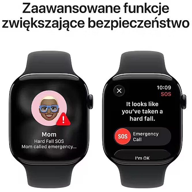 Jeszcze dłuższa praca baterii? Mamy to. Bateria Apple Watch Series 11 wystarcza nawet na 24 godziny normalnej pracy. Ogromny skok wydajności sprawia, że po całym dniu nie musisz zdejmować zegarka na noc, żeby go naładować. Dzięki temu masz lepszą wiedzę na temat swojego zdrowia. Sieć komórkowa to pełna swoboda Dzwoń i tekstuj. Series 11 obsługuje sieć komórkową. Z planem taryfowem jesteś w kontakcie niemal wszędzie, nawet jeśli na czas biegania Twój iPhone został w domu. Apple Watch Series 11 z kopertą z tytanu w kolorze naturalnym, pleciona opaska Solo w kolorze szarozielonym, połączenie przychodzące, widać zdjęcie osoby dzwoniącej, przyciski akceptacji lub odrzucenia połączenia, widać prawy bok urządzenia i pokrętło Digital Crown Zrobisz wszystko skinieniem. Szybkim obrotem nadgarstka wyciszysz przychodzące połączenie, wyłączysz minutnik, odrzucisz powiadomienie i nie tylko. Poręczne rozwiązanie, gdy masz zajęte ręce. Apple Pay. Pieniądze masz dosłownie pod ręką. Małe zakupy w biegu? Jednym stuknięciem w Apple Watch zapłacisz niemal za wszystko w miejscach oznaczonych symbolem płatności zbliżeniowych. Szybko i łatwo. Znajdź swojego iPhonea. Jeśli Twój iPhone gdzieś się zawieruszył, funkcja Znajdowanie dokładne wskaże Ci odległość od niego i kierunek. Kiedy zbliżysz się do urządzenia, dotykowe sygnały zwrotne i dźwiękowe oraz graficzny wskaźnik pomogą je zlokalizować. Stos inteligentny daje wskazówki. Sztos. Udoskonalone algorytmy predykcyjne wyciągają wnioski z danych gromadzonych na urządzeniu oraz analizy Twoich codziennych nawyków. Dzięki temu Stos inteligentny może dyskretnie zasugerować to, co w danej chwili przyda Ci się najbardziej. O, spójrz! Czas pobiegać. Bonjour. Tu Tłumaczenie na żywo. Dzięki Apple Intelligence na Twoim iPhonie aplikacja Wiadomości automatycznie tłumaczy tekst na wybrany język. No i to rozumiem. Funkcja dostępna w wybranych językach. Jego supermoc? Wzywa pomoc. Apple Watch Series 11 jest pełen innowacyjnych rozwiązań stworzonych z myślą o Twoim bezpieczeństwie. Zaprojektowaliśmy go tak, żeby wezwał pomoc, gdy jej najbardziej potrzebujesz. Nawet gdy nie masz przy sobie iPhone'a. Alarmowe SOS. ASAP. Pilnie potrzebujesz pomocy? Jeśli naciśniesz i przytrzymasz przycisk boczny, Apple Watch Series 11 postara się wezwać służby ratunkowe i udostępnić im Twoje położenie. Funkcja Wykrywanie upadków w pogotowiu. Apple Watch Series 11 wykrywa niebezpieczne upadki i pomaga wezwać służby ratunkowe. Ponadto przekazuje dyspozytorom informacje o Twojej lokalizacji i powiadamia bliskich. Chroni Cię funkcja Wykrywanie wypadków. Gdziekolwiek jesteś. W razie poważnego zderzenia samochodowego Series 11 automatycznie pomoże wezwać służby ratunkowe i powiadomi Twoje kontakty alarmowe. Wychodzisz? Zamelduj się. Dzięki funkcji Daj znać zegarek automatycznie powiadomi wybrane przez Ciebie osoby o dotarciu do celu. A jeśli idziesz pobiegać po zmroku, sesję Daj znać możesz uruchomić na czas treningu, żeby poinformować bliskich o jego zakończeniu. Z funkcją Ślad wrócisz na właściwe tory. Funkcja Ślad w apce Kompas potrafi automatycznie odtworzyć pokonaną przez Ciebie trasę, korzystając z danych GPS nawet gdy nie masz zasięgu. Możesz też łatwo dodać punkty nawigacyjne, takie jak miejsce wejścia na szlak czy obozowisko. Skonfiguruj swoją kartę medyczną. W razie wypadku Apple Watch Series 11 zapewni ratownikom szybki i bezpośredni dostęp do najważniejszych informacji o Twoim zdrowiu, takich jak alergie lub przyjmowane leki.