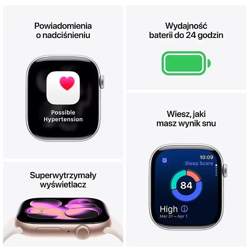 Im więcej wiesz o swoim zdrowiu, tym skuteczniej możesz się o nie zatroszczyć. Z Apple Watch Series 11 masz jego pełniejszy obraz. Dzięki apkom takim jak EKG i Parametry życiowe możesz na bieżąco monitorować swój stan. A przełomowa funkcja Powiadomienia o nadciśnieniu to nieocenione wsparcie w profilaktyce zdrowego serca. Powiadomienia o nadciśnieniu Nadciśnienie dotyka ponad 1,3 miliarda osób na całym świecie i stanowi główną przyczynę zawału serca, udaru czy chorób nerek. Nie daje objawów, więc często nie zostaje zdiagnozowane. Bywa przeoczone nawet podczas wizyty lekarskiej, ponieważ w jej trakcie dokonuje się zwykle tylko jednego pomiaru ciśnienia. Aby otrzymywać powiadomienia o nadciśnieniu, wystarczy nosić zegarek przez minimum 30 dni. Series 11 da Ci znać, jeśli zauważy symptomy możliwego nadciśnienia. Jak to działa? Czujnik optyczny gromadzi dane, które następnie analizowane są przez algorytm pod kątem ewentualnego nadciśnienia. W tym celu sprawdza się reakcje naczyń krwionośnych na bicie serca przez okres 30 dni. Zupełnie nowe spojrzenie. Twarde naukowe podstawy. Powiadomienia o nadciśnieniu to przełomowa funkcja, która została stworzona w oparciu o zaawansowane metody uczenia maszynowego oraz serię badań naukowych. Wzięło w nich udział ponad 100 000 osób. Ostatnim krokiem było sprawdzenie funkcji podczas badań klinicznych. Twój dziennik pomiarów ciśnienia tętniczego. Po otrzymaniu powiadomienia o nadciśnieniu możesz zacząć prowadzić dziennik pomiarów w aplikacji Zdrowie na iPhonie. Będziesz potrzebować do tego ciśnieniomierza. Twój dziennik ułatwi komunikację z lekarzem prowadzącym. Więcej funkcji wspierających zdrowie Sprawdź jakość snu na dzień dobry. Wpływają na nią takie czynniki jak długość snu, regularne zasypianie, liczba przebudzeń i czas przypadający na każdą fazę snu. Funkcja Wynik snu każdej nocy analizuje te czynniki, a rano przedstawia podsumowanie w formie czytelnego raportu. W ten sposób dowiesz się, co dokładnie wpływa na jakość Twojego snu, oraz jak sprawić, żeby był bardziej regenerujący. Nie przymykaj oka na bezdech senny. Polega on na powtarzających się epizodach zatrzymania oddychania podczas snu. Nieleczony bezdech senny może zwiększyć ryzyko nadciśnienia, cukrzycy typu 2, chorób serca oraz innych problemów zdrowotnych. Series 11 monitoruje zaburzenia oddychania podczas snu i powiadamia o możliwym bezdechu sennym. Apka Parametry życiowe. Wgląd w Twój codzienny stan zdrowia na cito. Szybko sprawdzisz w niej dane zarejestrowane w nocy, w tym tętno, częstość oddechów, temperaturę nadgarstka, natlenienie krwi czy długość snu. Dostaniesz też powiadomienie, jeśli wartości będą odbiegały od normy. Aplikacja EKG. Serce na dłoni. Apka EKG w Series 11 pozwala wykryć objawy migotania przedsionków oraz oznaki nieregularnego rytmu serca. Pomiary wykonywane są prosto z nadgarstka na podobnej zasadzie jak w elektrokardiografie jednoodprowadzeniowym. Z aplikacją Tętno trzymasz rękę na pulsie. Sprawdzisz go w dowolnej chwili. Otrzymasz również powiadomienia, gdy tętno będzie zbyt wysokie lub zbyt niskie, a także w przypadku wystąpienia arytmii. Śledzenie cyklu pozwoli Ci być na bieżąco. Każdy cykl menstruacyjny jest inny. Obserwując swój, dobrze poznasz jego rytm. Funkcja Śledzenie cyklu pozwoli Ci zapisywać przebieg miesiączki i towarzyszących jej objawów. Otrzymasz przewidywaną datę kolejnego okresu oraz dni płodnych. Funkcja powiadomi Cię również w razie nietypowego przebiegu cyklu. Szacunkowy czas owulacji na podstawie wcześniejszych danych. Series 11 ma zaawansowany czujnik, który monitoruje Twoją temperaturę w czasie snu. Apka Śledzenie cyklu na podstawie tych danych wyznaczy prawdopodobny czas owulacji. Informacje te są niezwykle pomocne w planowaniu rodziny. Pomiar natlenienia krwi. Zapierająca dech innowacja. Apple Watch Series 11 wyposażono w czujnik i apkę, które mierzą natlenienie krwi zarówno wtedy, gdy chcesz to sprawdzić, jak i w tle. Dniem i nocą. Kto zna wyniki, ten ma wyniki Niezależnie od tego, czy chcesz poprawić swoje wyniki na bieżni czy na basenie, Apple Watch Series 11 pomoże Ci w treningu na niezliczone sposoby. Urządzenie mierzy każdy Twój ruch, analizując wiele przydatnych parametrów. Bo gdy wiesz więcej, osiągasz więcej. Brzmi sprytnie? No to zaczynamy! Rozpocznij trening jednym kliknięciem. Odświeżona apka Trening. Zaskakuje formą. W jej udoskonalonym interfejsie znajdziesz umieszczone w rogu cztery nowe przyciski. Zapewniają szybszy dostęp do takich funkcji jak: Tempo bazowe, Wyścig na trasie i Trening własny. Rób kolejne okrążenia Pierścieni aktywności. W ruchu, Ćwiczenie, Na nogach. W apce Aktywność animacja domykania pierścieni odwzorowuje to, jak się poruszasz. Możesz także wstrzymywać pierścienie i dostosowywać swoje cele na każdy dzień tygodnia. Wspiera biegaczy na każdym poziomie Niezależnie od tego, jakie są Twoje biegowe cele, dzięki zaawansowanym funkcjom Apple Watch osiągniesz je z łatwością. Wytrzymała bateria, precyzyjny GPS i motywujące funkcje, które pozwalają na bieżąco śledzić treningi, zapewnią Ci idealny start. Czas na Twoją nową życiówkę. Obciążenie treningowe sprawdzisz lekką ręką. Dzięki pomocnym analizom masz lepszy wgląd w to, jak intensywność treningów wpływa na Twoje ciało. Będziesz wiedzieć, kiedy dokręcić śrubę, a kiedy odpocząć. Stwórz swój własny trening. Dopasuj ćwiczenia do własnych potrzeb na Apple Watch albo iPhonie. Możesz modyfikować cele, np. czas aktywności, dystans czy liczbę spalanych kalorii. Otrzymasz także alerty dotyczące tempa, tętna, kadencji i mocy. Twoje dane treningowe na iPhonie. Pomiary wykonane przez Series 11 podczas treningu znajdziesz w aplikacji Fitness na iPhonie. Prześledzisz tam swoje postępy i ukończone treningi, zmo