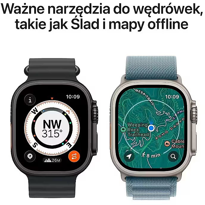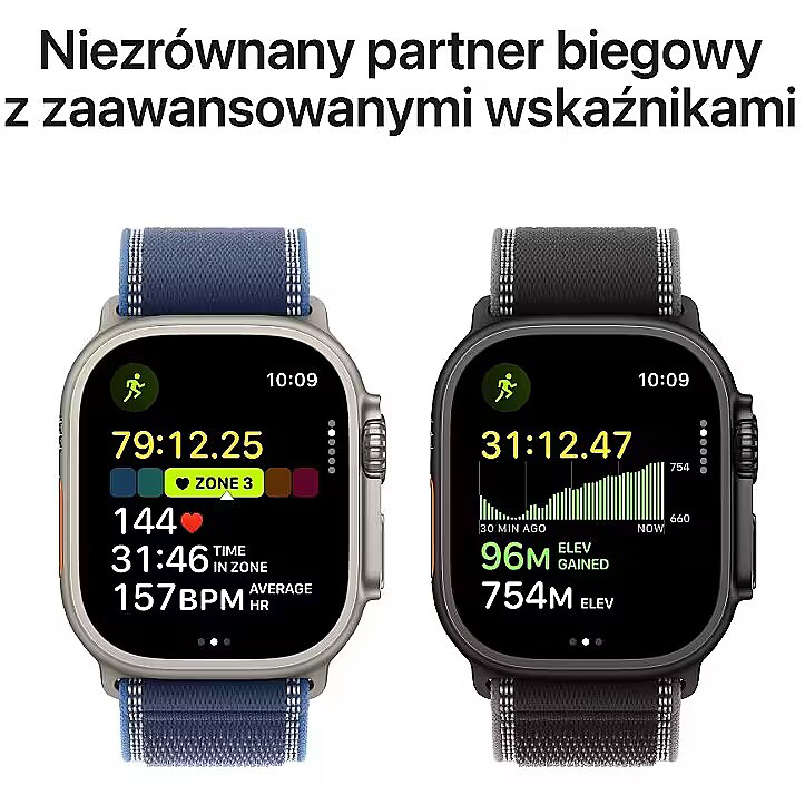 Apple Watch Ultra 3 został zaprojektowany z myślą o jeszcze większej wydajności baterii dla celów śmielszych i ambitniejszych niż kiedykolwiek. Kiedy potrzebujesz dodatkowej energii, możesz skorzystać z szybkiego ładowania i uzupełnić baterię na 12 godzin normalnego użytkowania w zaledwie 15 minut. Mistrz wieloboju. Apple Watch Ultra 3 przenosi na wyższy poziom wszystkie Twoje wyczyny sportowe. Podczas jazdy na rowerze aktywnie monitoruje Twoją prędkość i efektywność, dzięki czemu postępy widzisz w czasie rzeczywistym. Podczas treningu pływackiego na bieżąco rejestruje zestawy, automatycznie wykrywa styl i oblicza całkowity dystans. Twoje rekordy są na wyciągnięcie ręki. Znajdź swoje Strefy mocy. Podłączając osobisty miernik mocy do Ultra 3, oszacujesz swoją funkcjonalną moc progową, czyli najwyższy poziom intensywności, który teoretycznie jesteś w stanie utrzymać przez godzinę. Ta wartość aktywuje funkcję Strefy mocy pokazującą bieżącą moc, czas w strefie oraz średnią moc podczas aktywności. Aplikacja Trening pokazująca parametry funkcji Strefy mocy, trening przebiega w 4 strefie Obserwuj parametry jazdy na rowerze na swoim iPhonie. Trening na rowerze, który zainicjujesz na Ultra 3, automatycznie wyświetli się jako wydarzenie na żywo na iPhonie. Możesz więc łatwiej i bezpieczniej przeglądać rejestrowane dane na swoim telefonie przymocowanym do kierownicy. Nastaw się na Widoki treningu. Chcesz sprawdzić swoją bieżącą prędkość na rowerze? W funkcji Widoki treningu wybrane wskaźniki przesuwają się na środek, aby można je było wygodnie śledzić. A przekręcając pokrętło Digital Crown, łatwo przełączysz się między takimi parametrami jak Strefy tętna, rundy czy Wysokość n.p.m. Bezkonkurencyjny Trening mieszany. Ultra 3 wykrywa, kiedy po pływaniu wskakujesz na rower, a potem jeszcze ruszasz do biegu, i śledzi wskaźniki dla każdej z tych dyscyplin. Rejestrowanie segmentów treningu triatlonowego nigdy nie było tak proste. Styl się liczy. W basenie Ultra 3 samoczynnie wykrywa styl pływania, oblicza automatyczne zestawy z dystansem i tempem, a także generuje zaawansowane pomiary, takie jak SWOLF, żeby zmierzyć efektywność Twojej aktywności. Na szczytach. I w głębinach. Zdobywanie nowych szczytów i nurkowanie w głębinach wymagają specjalistycznych narzędzi. Apple Watch Ultra 3 został wyposażony w przełomowe funkcje, w tym zaawansowany kompas czy w pełni funkcjonalny komputer nurkowy dlatego mając przy sobie tak niewiele, masz sprzęt na każdą wyprawę. Ślad pozwala znaleźć drogę powrotną. Jeśli zgubisz się na szlaku, funkcja Ślad automatycznie odtworzy pokonaną przez Ciebie trasę, korzystając z danych GPS nawet gdy nie masz zasięgu. Możesz też łatwo dodać ważne punkty na trasie, takie jak miejsce wejścia na szlak czy obozowisko. Funkcja Ślad pokazująca kompas, wysokość n.p.m. oraz zaznaczone punkty trasy Przecieraj szlaki, także te niestandardowe. Twórz i zapisuj na iPhonie własne trasy spacerów i wędrówek. Do wyboru masz różne opcje przejścia: drogę w jedną stronę, tam i z powrotem lub pętlę. Możesz też otrzymać wskazówki krok po kroku prosto z nadgarstka. Mierz wysoko z Wędrówką. Wśród treningów na Ultra 3 znajdziesz pieszą wędrówkę, dzięki której możesz rejestrować tempo, dystans, przewyższenie i spalone kalorie. Obserwuj w czasie rzeczywistym, jak wysoko udało Ci się wspiąć, a na koniec wędrówki sprawdź łączne przewyższenie. Sięgaj gwiazd. Karta treningu Wędrówka, na której widać czas i wysokość n.p.m. Możesz pobierać mapy offline. Zaplanuj z wyprzedzeniem trasę swojej wędrówki i pobierz na iPhonea mapę offline. Zostanie automatycznie zsynchronizowana z Twoim zegarkiem i podpowie Ci, którędy iść, gdy znajdziesz się w nieznanym terenie. Apple Watch Ultra 3 z kopertą z tytanu w kolorze naturalnym, widać mapy offline i kolejne wskazówki, zegarek ma opaskę Alpine w kolorze terakoty Wyznaczaj punkty trasy w apce Kompas. Możesz oznaczyć swoją bieżącą lokalizację lub wyróżnić początek szlaku bądź obozowisko. Punkty trasy z łącznością komórkową automatycznie wskazują lokalizację, w której po raz ostatni na Twojej trasie dostępna była łączność komórkowa. Z takim wyposażeniem głębia jest Twoja. Opracowana wspólnie z Huish Outdoors apka Oceanic+ zmienia Ultra 3 w pełni funkcjonalny komputer nurkowy wykorzystujący algorytm dekompresyjny Bühlmanna. Przekręcając pokrętło Digital Crown, jednym spojrzeniem sprawdzisz przydane informacje. Aplikacja będzie na bieżąco wyliczać i monitorować parametry nurkowania oraz generować niezbędne ostrzeżenia. Apple Watch Ultra 3 z kopertą z tytanu w kolorze naturalnym, widać parametry z aplikacji Oceanic+: głębokość, czas dekompresji, czas nurkowania, minuty do wynurzenia, temperatura wody, zegarek ma pasek Ocean w kolorze neonowej zieleni Pobierz apkę Oceanic+