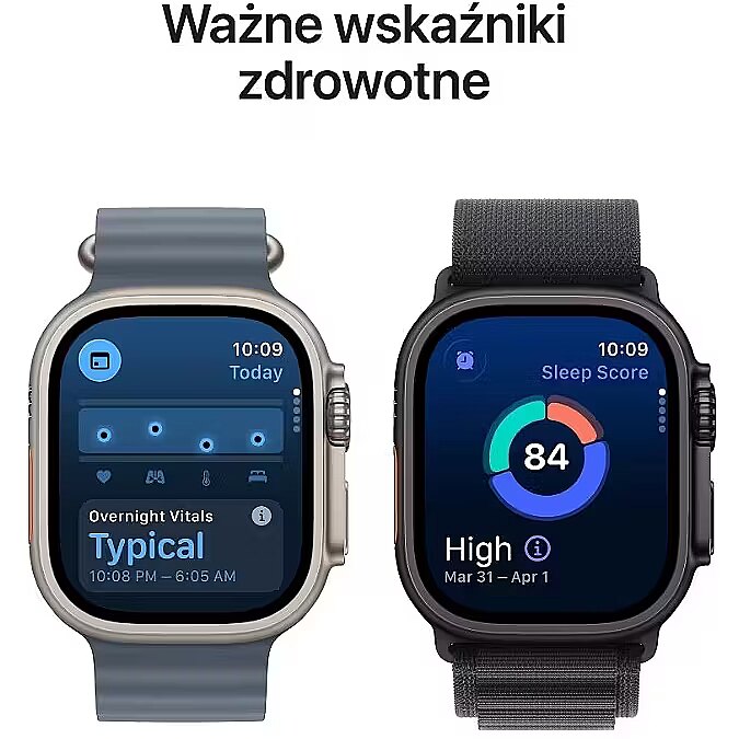 Im więcej wiesz o swoim zdrowiu, tym skuteczniej możesz się o nie zatroszczyć. Z Apple Watch Ultra 3 masz jego pełniejszy obraz. Dzięki apkom takim jak EKG i Parametry życiowe możesz na bieżąco monitorować swój stan. A przełomowa funkcja Powiadomienia o nadciśnieniu to nieocenione wsparcie w profilaktyce zdrowego serca. Powiadomienia o nadciśnieniu. Nadciśnienie dotyka ponad 1,3 miliarda osób na całym świecie i stanowi główną przyczynę zawału serca, udaru czy chorób nerek. Często nie zostaje zdiagnozowane, ponieważ nie daje objawów. Bywa przeoczone nawet podczas wizyty lekarskiej, ponieważ w jej trakcie dokonuje się zwykle tylko jednego pomiaru ciśnienia. Aby otrzymywać powiadomienia o nadciśnieniu, wystarczy nosić zegarek przez minimum 30 dni. Ultra 3 wyśle Ci powiadomienie, jeśli zauważy symptomy możliwego nadciśnienia. Jak to możliwe? Czujnik optyczny gromadzi dane, które następnie analizowane są przez algorytm pod kątem ewentualnego nadciśnienia. W tym celu sprawdzane są reakcje naczyń krwionośnych na bicie serca przez okres 30 dni. Zupełnie nowe spojrzenie. Twarde naukowe podstawy. Przełomowa funkcja Powiadomienia o nadciśnieniu została stworzona w oparciu o zaawansowane metody uczenia maszynowego oraz serię badań naukowych, w których wzięło udział ponad 100 000 osób. Ostatnim krokiem było sprawdzenie jej podczas badań klinicznych. Twój dziennik pomiarów ciśnienia tętniczego. Po otrzymaniu powiadomienia o nadciśnieniu możesz zacząć prowadzić dziennik pomiarów w aplikacji Zdrowie na iPhonie. Będziesz potrzebować do tego ciśnieniomierza. Twój dziennik ułatwi komunikację z lekarzem prowadzącym. Sprawdź jakość snu na dzień dobry. Jakość snu zależy od czynników takich jak jego długość, regularne godziny zasypiania, częstotliwość przebudzeń i czas trwania poszczególnych faz snu. Funkcja Wynik snu każdej nocy analizuje te czynniki, a rano przedstawia podsumowanie w formie czytelnego raportu. W ten sposób dowiesz się, co dokładnie wpływa na jakość Twojego snu, oraz jak sprawić, żeby był bardziej regenerujący. Nie przymykaj oka na bezdech senny. Polega on na powtarzających się epizodach zatrzymania oddychania podczas snu. Nieleczony bezdech senny może zwiększyć ryzyko nadciśnienia, cukrzycy typu 2, chorób serca oraz innych problemów zdrowotnych. Ultra 3 potrafi monitorować zaburzenia oddychania i wysyłać powiadomienia o możliwym bezdechu sennym. Obserwuj codziennie stan zdrowia z apką Parametry życiowe. Aplikacja Parametry życiowe wyznacza typowy zakres wartości dla rejestrowanych w nocy wskaźników zdrowotnych, takich jak tętno, częstość oddechów, temperatura nadgarstka i długość snu16. Wystarczy rzut oka, żeby śledzić zachodzące zmiany. Rób EKG, kiedy i gdzie chcesz. Sprawdzaj objawy migotania przedsionków, korzystając z aplikacji EKG, która generuje jednoodprowadzeniowy zapis EKG. Dane te możesz następnie przekazać swojemu lekarzowi. Otrzymuj powiadomienia o zdrowiu serca. Apple Watch Ultra 3 korzysta z optycznego czujnika tętna oraz zaawansowanych algorytmów do monitorowania pracy Twojego serca przez cały dzień. O niepokojąco wysokim lub niskim tętnie bądź arytmii dowiesz się w apce Tętno. Śledź swój cykl menstruacyjny. Otrzymasz powiadomienie, jeśli wprowadzone przez Ciebie szczegóły cyklu menstruacyjnego będą wskazywać na rzadkie lub nieregularne miesiączkowanie, przedłużone krwawienia czy przewlekłe plamienie. Szacunkowy czas owulacji na podstawie wcześniejszych danych. Ultra 3 ma zaawansowane czujniki, które monitorują temperaturę nadgarstka w czasie snu20. Apka Śledzenie cyklu analizuje te dane i na ich podstawie wyznacza prawdopodobny czas ostatniej owulacji. Informacje te mogą pomóc w planowaniu rodziny. Pomiar natlenienia krwi. Zapierająca dech innowacja. Apple Watch Ultra 3 wyposażono w czujnik i apkę, które mierzą natlenienie krwi zarówno wtedy, gdy chcesz to sprawdzić, jak i w tle. Dniem i nocą. Wspaniały w każdych warunkach.