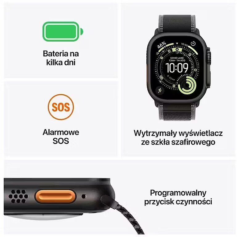 Apple Watch Ultra 3 został zaprojektowany z myślą o jeszcze większej wydajności baterii dla celów śmielszych i ambitniejszych niż kiedykolwiek. Kiedy potrzebujesz dodatkowej energii, możesz skorzystać z szybkiego ładowania i uzupełnić baterię na 12 godzin normalnego użytkowania w zaledwie 15 minut. Mistrz wieloboju. Apple Watch Ultra 3 przenosi na wyższy poziom wszystkie Twoje wyczyny sportowe. Podczas jazdy na rowerze aktywnie monitoruje Twoją prędkość i efektywność, dzięki czemu postępy widzisz w czasie rzeczywistym. Podczas treningu pływackiego na bieżąco rejestruje zestawy, automatycznie wykrywa styl i oblicza całkowity dystans. Twoje rekordy są na wyciągnięcie ręki. Znajdź swoje Strefy mocy. Podłączając osobisty miernik mocy do Ultra 3, oszacujesz swoją funkcjonalną moc progową, czyli najwyższy poziom intensywności, który teoretycznie jesteś w stanie utrzymać przez godzinę. Ta wartość aktywuje funkcję Strefy mocy pokazującą bieżącą moc, czas w strefie oraz średnią moc podczas aktywności. Aplikacja Trening pokazująca parametry funkcji Strefy mocy, trening przebiega w 4 strefie Obserwuj parametry jazdy na rowerze na swoim iPhonie. Trening na rowerze, który zainicjujesz na Ultra 3, automatycznie wyświetli się jako wydarzenie na żywo na iPhonie. Możesz więc łatwiej i bezpieczniej przeglądać rejestrowane dane na swoim telefonie przymocowanym do kierownicy. Nastaw się na Widoki treningu. Chcesz sprawdzić swoją bieżącą prędkość na rowerze? W funkcji Widoki treningu wybrane wskaźniki przesuwają się na środek, aby można je było wygodnie śledzić. A przekręcając pokrętło Digital Crown, łatwo przełączysz się między takimi parametrami jak Strefy tętna, rundy czy Wysokość n.p.m. Bezkonkurencyjny Trening mieszany. Ultra 3 wykrywa, kiedy po pływaniu wskakujesz na rower, a potem jeszcze ruszasz do biegu, i śledzi wskaźniki dla każdej z tych dyscyplin. Rejestrowanie segmentów treningu triatlonowego nigdy nie było tak proste. Styl się liczy. W basenie Ultra 3 samoczynnie wykrywa styl pływania, oblicza automatyczne zestawy z dystansem i tempem, a także generuje zaawansowane pomiary, takie jak SWOLF, żeby zmierzyć efektywność Twojej aktywności. Na szczytach. I w głębinach. Zdobywanie nowych szczytów i nurkowanie w głębinach wymagają specjalistycznych narzędzi. Apple Watch Ultra 3 został wyposażony w przełomowe funkcje, w tym zaawansowany kompas czy w pełni funkcjonalny komputer nurkowy dlatego mając przy sobie tak niewiele, masz sprzęt na każdą wyprawę. Ślad pozwala znaleźć drogę powrotną. Jeśli zgubisz się na szlaku, funkcja Ślad automatycznie odtworzy pokonaną przez Ciebie trasę, korzystając z danych GPS nawet gdy nie masz zasięgu. Możesz też łatwo dodać ważne punkty na trasie, takie jak miejsce wejścia na szlak czy obozowisko. Funkcja Ślad pokazująca kompas, wysokość n.p.m. oraz zaznaczone punkty trasy Przecieraj szlaki, także te niestandardowe. Twórz i zapisuj na iPhonie własne trasy spacerów i wędrówek. Do wyboru masz różne opcje przejścia: drogę w jedną stronę, tam i z powrotem lub pętlę. Możesz też otrzymać wskazówki krok po kroku prosto z nadgarstka. Mierz wysoko z Wędrówką. Wśród treningów na Ultra 3 znajdziesz pieszą wędrówkę, dzięki której możesz rejestrować tempo, dystans, przewyższenie i spalone kalorie. Obserwuj w czasie rzeczywistym, jak wysoko udało Ci się wspiąć, a na koniec wędrówki sprawdź łączne przewyższenie. Sięgaj gwiazd. Karta treningu Wędrówka, na której widać czas i wysokość n.p.m. Możesz pobierać mapy offline. Zaplanuj z wyprzedzeniem trasę swojej wędrówki i pobierz na iPhonea mapę offline. Zostanie automatycznie zsynchronizowana z Twoim zegarkiem i podpowie Ci, którędy iść, gdy znajdziesz się w nieznanym terenie. Apple Watch Ultra 3 z kopertą z tytanu w kolorze naturalnym, widać mapy offline i kolejne wskazówki, zegarek ma opaskę Alpine w kolorze terakoty Wyznaczaj punkty trasy w apce Kompas. Możesz oznaczyć swoją bieżącą lokalizację lub wyróżnić początek szlaku bądź obozowisko. Punkty trasy z łącznością komórkową automatycznie wskazują lokalizację, w której po raz ostatni na Twojej trasie dostępna była łączność komórkowa. Z takim wyposażeniem głębia jest Twoja. Opracowana wspólnie z Huish Outdoors apka Oceanic+ zmienia Ultra 3 w pełni funkcjonalny komputer nurkowy wykorzystujący algorytm dekompresyjny Bühlmanna. Przekręcając pokrętło Digital Crown, jednym spojrzeniem sprawdzisz przydane informacje. Aplikacja będzie na bieżąco wyliczać i monitorować parametry nurkowania oraz generować niezbędne ostrzeżenia. Apple Watch Ultra 3 z kopertą z tytanu w kolorze naturalnym, widać parametry z aplikacji Oceanic+: głębokość, czas dekompresji, czas nurkowania, minuty do wynurzenia, temperatura wody, zegarek ma pasek Ocean w kolorze neonowej zieleni Pobierz apkę Oceanic+