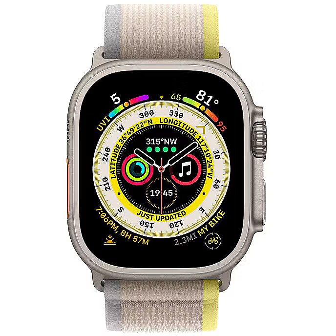 To build the ultimate sports watch, Apple crafted every element with painstaking attention to detail for unparalleled performance. Titanium strikes the perfect balance between weight, ruggedness, and corrosion resistance. The new case design rises up to surround the flat sapphire crystal and protect it from edge impacts. The Digital Crown is larger and the side button is raised from the case, making them easier to use while you’re wearing gloves. 49 mm titanium case Water resistance 100 m Tested to MIL-STD 810H IP6X dust resistance The biggest and brightest Apple Watch display. The Always‑On Retina display is 2000 nits at its peak and twice as bright as any other Apple Watch. The bigger display provides more room for workout metrics and detail‑packed watch faces. The Wayfinder face lets you rotate the Digital Crown to activate Night Mode for better viewing in low light situations. Ready for Action. The new Action button gives you quick, physical control over a variety of functions. It’s customizable and can do things like control a workout, mark a Compass Waypoint, or begin a dive. Just like you, it’s full of potential. Everything in its place. An essential and versatile tool that fits on your wrist, Apple Watch Ultra packs incredible capability into a surprisingly small space. Battery life for days. When you’re on the second day of a backpacking trip, the final leg of a triathlon, or diving along a coral reef, the last thing you want to think about is running out of battery. With longer battery life than ever, you can take on almost anything and have energy to spare. Trail Loop. Comfort for the long run. Designed to be light, thin, and flexible. It features a fuss-free loop closure for quick adjustments during workouts. Extra stretch built into the webbing makes it easy to cinch for optimal fit. Push farther. Run wilder.