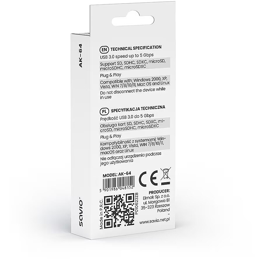 Description - The SAVIO AK-64 USB 3.0 SD card reader is a versatile device that allows you to comfortably read data from various types of memory cards. Thanks to this compact and efficient gadget, transferring photos, files and other information from memory cards to your computer becomes extremely fast and convenient. Supports a wide variety of media The reader has been designed with high compatibility in mind, supporting various types of memory cards such as SD, SDHC, SDXC, microSD, microSDHC and microSDXC. This is perfect for those who use a variety of storage media. Even greater performance Thanks to the USB 3.0 interface, connecting the reader to the computer is quick and efficient. This latest version of the interface guarantees faster data transfer and higher performance than previous versions. Plug & Play mode The reader operates in Plug & Play mode, which means that no additional drivers or programs need to be installed. Simply plug in the device and the data is automatically read out, ensuring that it is immediately ready for use. Compatible with many systems The SAVIO AK-64 is compatible with various operating systems such as Windows 2000, XP, Vista, WIN 7/8/10/11, macOS and Linux. No matter which operating system you use, you can enjoy efficient and convenient reading of data from memory cards. Remember not to disconnect the device while it is running to avoid possible data problems. Technical specification: Interface: USB 2.0 / USB 3.0 Card suport: SD, SDHC, SDXC, microSD, microSDHC, microSDXC Data transfer up to 5 Gbps Dimensions: 57.5 × 17 × 8.3 mm Weight: 7 g Colour: black Compatibility: Windows 2000, XP, Vista, WIN 7/8/10/11, macOS oraz Linux
