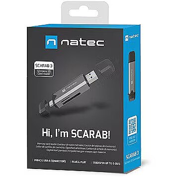 Be surprised and see how simple file transfer between devices can be with the Natec Scarab 3. This compact memory card reader features two ports (USB Type-A and USB Type-C). They allow for easy connection to both older and new devices. The Natec Scarab 3 will also save you time. A 5 Gb/s throughput guarantees efficient transfer of both photos and videos in any situation.