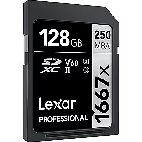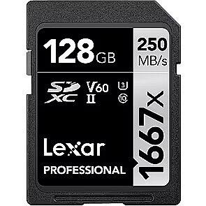 Lexar 128GB Professional 1667x SDXC UHS-II cards, up to 250MB/s read 90MB/s write C10 V60 U3