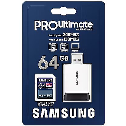 Description - SD Pro Ultimate Memory Card Optimized for creativity Incredible performance to optimize your creative workflow. The Samsung PRO Ultimate UHS-I SD Card delivers exceptional stability, high performance and reliability to meet the demands of professional photographers and content creators. The art of speed Sequential read and write speeds of up to 200 and 130 MB/s free up more time for creativity. Combined with U3 and V30 performance that enables continuous shooting and UHD 4K video recording, the PRO Ultimate card is the perfect choice for professionals demanding the highest quality. A place for all your inspirations Storage you can count on. With capacities ranging from 64GB to 512GB, the PRO Ultimate Card has plenty of room to capture and store your work, so you can see your project through to completion, no matter how big or ambitious it is. The power of versatility Unlock your creative possibilities with the Samsung PRO Ultimate SD card. Designed to work seamlessly with DSLR cameras, mirrorless cameras, digital cameras, as well as desktop and laptop computers, this versatile memory card lets you create content with confidence and ease. Solid reliability Confidence and peace of mind when you need it most. The PRO Ultimate SD card is backed by comprehensive 7-factor protection and a 10-year limited warranty to ensure uninterrupted performance under intensive use in extreme conditions. The world's #1 flash memory Top performance and reliability from the world's best-selling flash memory brand since 2003* * Source: OMDIA data for 2003-2022: market shares of NAND memory suppliers