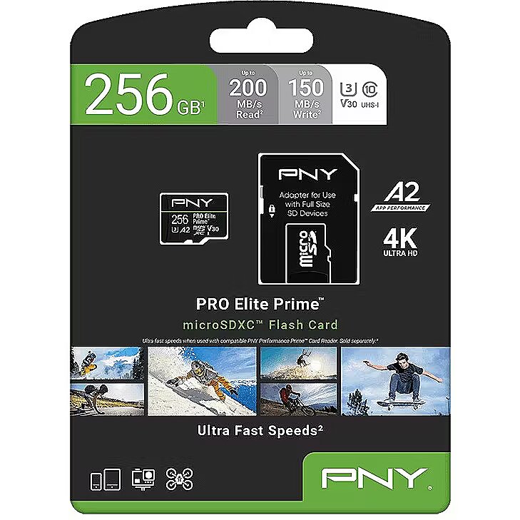 Description - Memory card microSDXC Elite Prime 256GB + adapter SD Experience next level performance & high-capacity storage options up to 1.5TB with PRO Elite Prime microSD cards! Offering extreme speeds of up to 200MB/s read & up to 150MB/s write when used with PNY Performance Prime Card Reader. Quickly capture high quality content, transfer, store and share media between devices at superior speeds, particularly useful when editing footage. Ideal for capturing 4K video, HD photos, music, apps, & more.