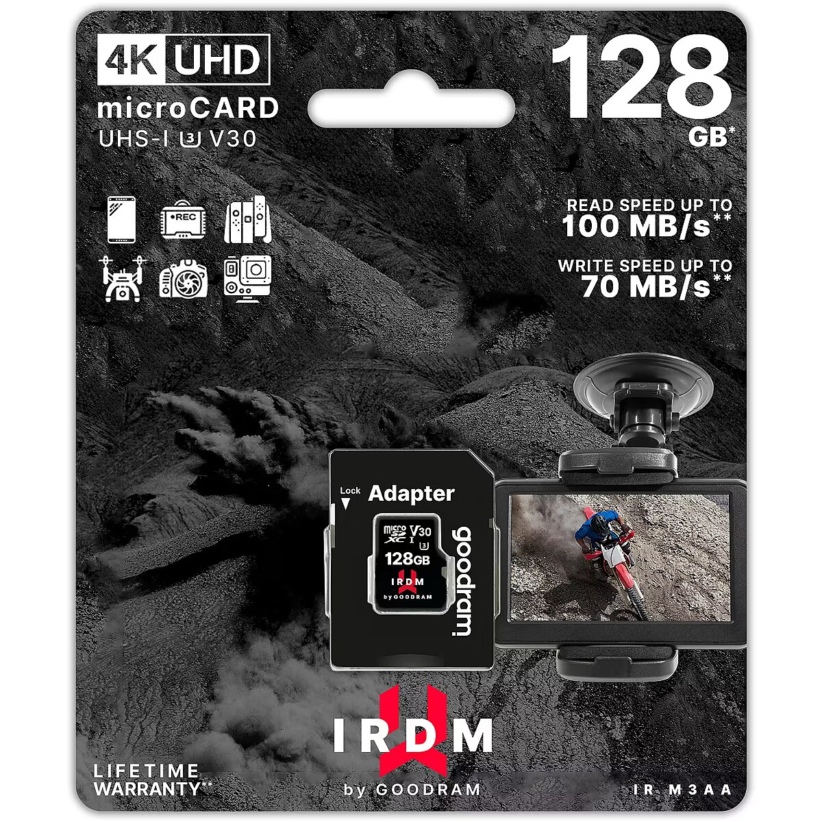 LongSummaryDescription - Goodram IRDM. Capacity: 128 GB, Flash card type: MicroSDXC, Flash memory class: Class 10, Internal memory type: UHS-I, Read speed: 100 MB/s, Write speed: 70 MB/s, UHS Speed Class: Class 3 (U3), Video Speed Class: V30. Protection features: Shock resistant, Water resistant, X-ray proof, Product colour: Black