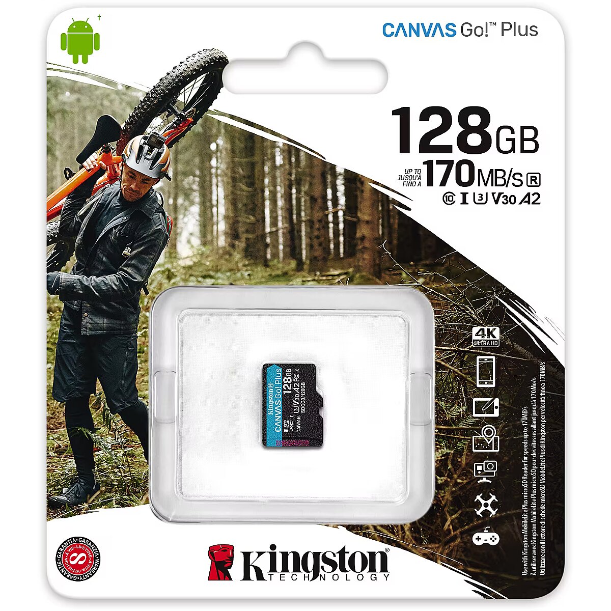 Description - Canvas Go! Plus microSD Memory Card for Android mobile devices, action cams, drones and 4K video production Kingston’s Canvas Go! Plus microSD is for adventurers who are always on the go chasing the perfect moment to capture. With superior transfer speeds of up to 170MB/s1, the Canvas Go! Plus microSD card accelerates your workflow and efficiency so that you’ll have more time to take your creativity onto the next adventure. With U3 and V30 speed performance, shoot stunning 4K Ultra-HD videos without worrying about slow speeds and dropped frames, or shoot fast-action photos that are seamless and consistent. The Canvas Go! Plus microSD supports A2 Application Performance Class to expedite your workflow with faster application performance on smartphones and tablets. An optional SD adapter provides added versatility for use with SD-compatible devices. View the world as your canvas and take your creativity and inspiration on the road with the Canvas Go! Plus microSD.