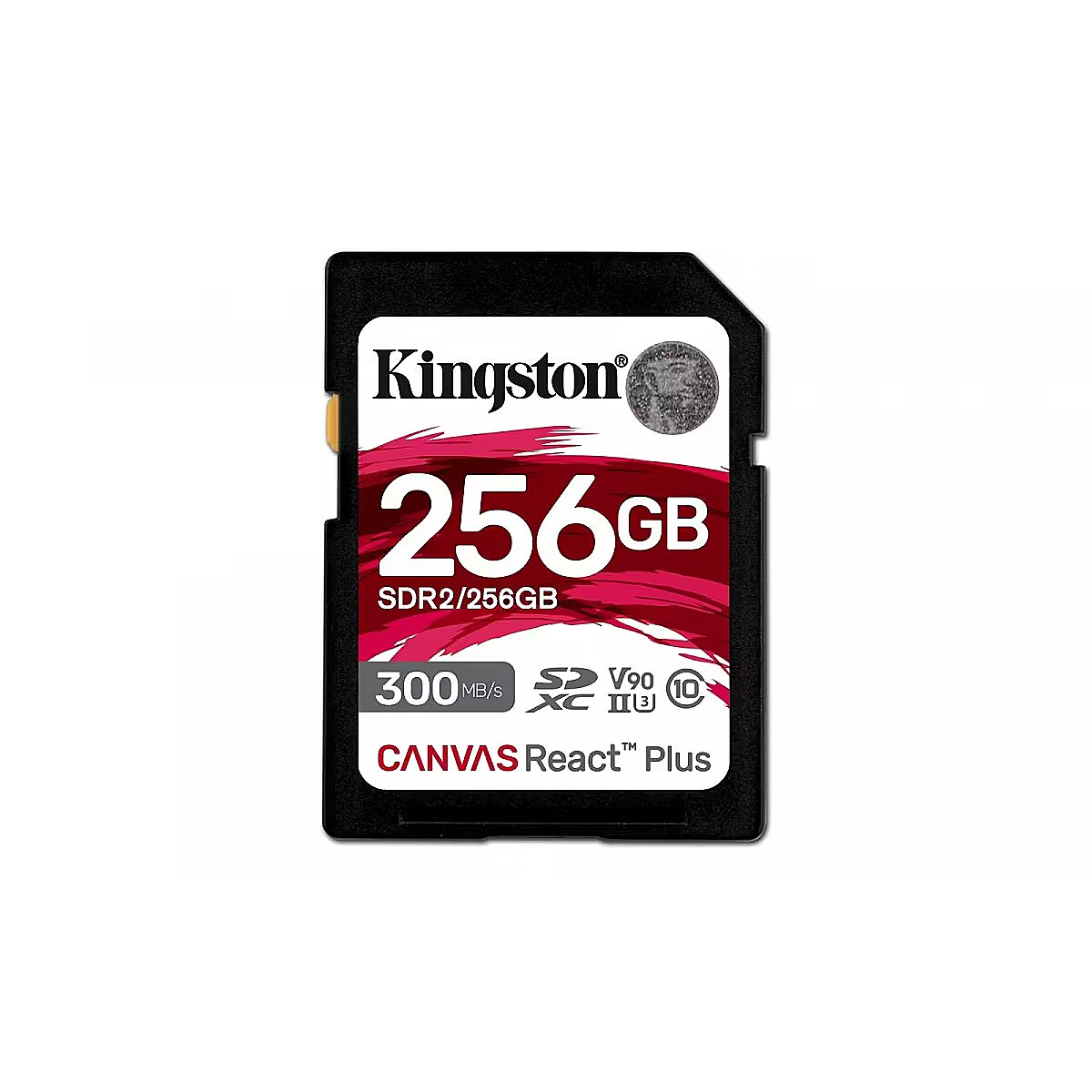 LongDesc - Canvas React Plus SD memory card - for 8K/3D/VR professional UHS-II cinema camerasKingston’s Canvas React Plus SD card delivers high-performance speeds which are designed to work with industry-standard professional UHS-II cameras for creatives who shoot 8K/3D/VR videos and high-resolution photos. Designed with the latest UHS-II standards and top-of-the-line U3 and V90 speed classes, the Canvas React Plus SD enables you to shoot sequential burst-mode shots with recording speeds of up to 260MB/s*. Execute your creativity without experiencing slow speeds and dropped frames while maximising workflow and efficiency. With transfer speeds of up to 300MB/s*, enhance your post-production process and handle heavy workloads with ease while capturing cinematic quality in high resolution.Kingston’s Canvas React Plus SD card is the go-to performance SD card for content creators making their way in digital filmmaking and professional photography.Ultimate speeds to support professional camera useWith transfer speeds of up to 300MB/s* for enhanced post-production workflow efficiency and recording speeds of up to 260MB/s*, this card easily handles burst mode shots and high-performance 3D/VR filming.High-performance UHS-II standard for reliable high-resolution photography and video recordingCapture 8K Ultra-HD high-speed shots and 3D/VR videos without dropping frames.Top-of-the-line performance for professional content creatorsThe Canvas React Plus leverages UHS-II Speed Class 3 (U3) and Video Speed Class 90 (V90) for peak performance with professional camcorders and digital cinema cameras.DurableFor peace of mind, cards are extensively tested and proven to be waterproof, temperature proof and X-ray proof.***