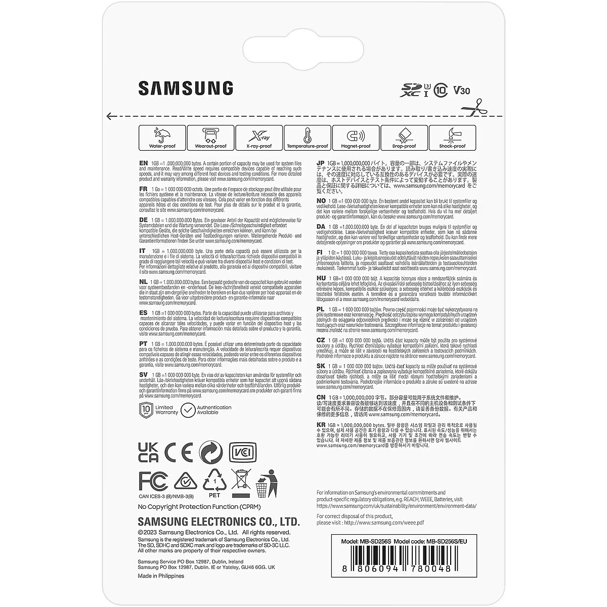 Description - SD PRO Plus MB-SD256S/EU 256GB memory card Made for professionals Constructed with durability in mind, the Samsung PRO Plus card, available in a range of capacities, boasts reliability and performance, making it an ideal choice for photographers, content creators and digital media professionals. The card is designed for use in cameras and computers. The trusted No.1 brand in flash memory. Experience extreme speed The perfect choice for professionals. Read and write speeds of 180 MB/s and 130 MB/s respectively enable dynamic continuous shooting and smooth 4K video capture. Capture truly perfect content for your audience. Choose the capacity for you Space for all your memories. Cards of 512, 256, 128 and 64 GB are available to meet users' storage needs. With this variety, you can always have the SD card that suits your needs. Data security Highly durable with comprehensive 7 factor immunity protection. It's built to withstand harsh conditions and heavy use, whether you're at home, outdoors or on the move. A 10-year limited warranty provides long-lasting peace of mind. The world's No.1 flash drive Experience the extraordinary performance and reliability that is only guaranteed by a brand that has been the world leader in flash memory since 2003. All firmware and components, including Samsung's world-renowned DRAM and NAND, are manufactured in-house, resulting in total quality control.