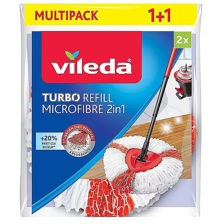 Description - TURBO 2-in-1 Swivel Mop Refill 2 Pieces 166142 Newest rotary mop refill design for even better surface cleaning Fits all Vileda TURBO rotary mops and all Easy Wring and Clean mops White fibres remove tough dirt and dried-on stains effectively Red fibers remove 20% more fines and dirt from floors Composition: Microfibre 64%, Polyester 21%, Polyamide 15%. Rotary mop refills are replaceable and can be washed at 60°C Package contains 2 cartridges