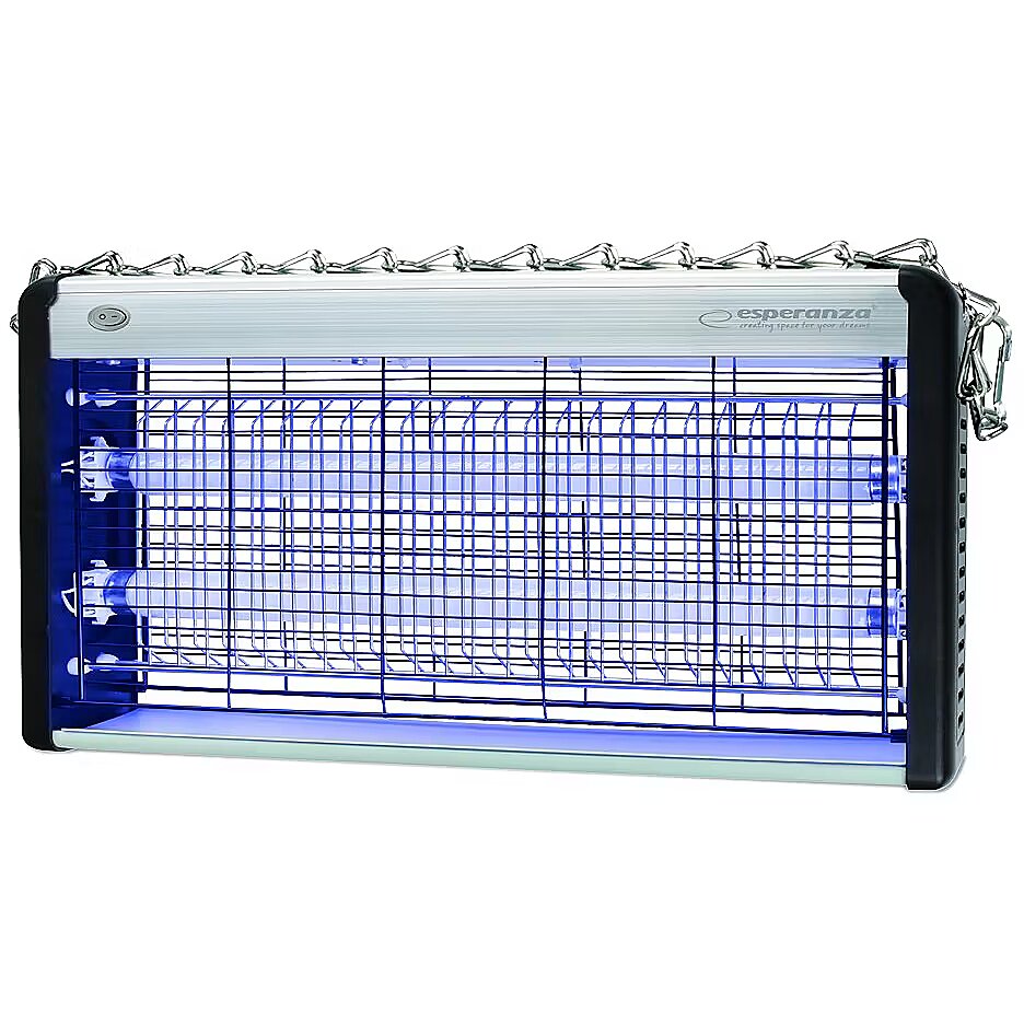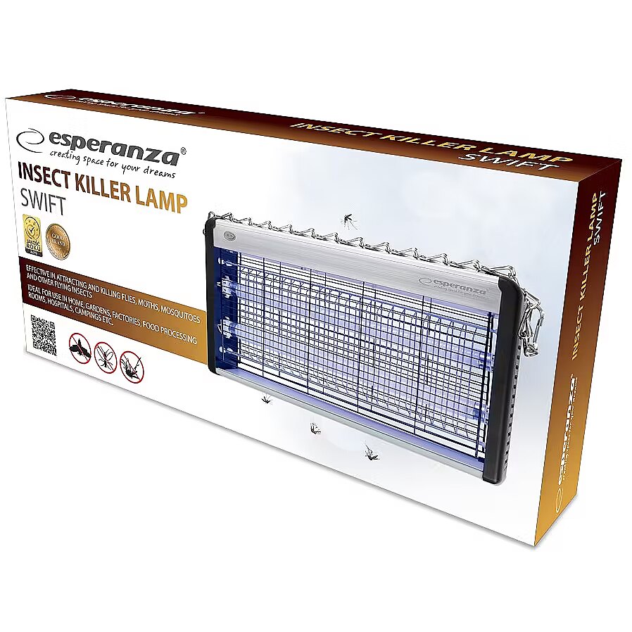 Description - Esperanza insect killer lamp is very effective in attracting insects such as flies, moths, mosquitoes and other flying insects and then kill them silently . It does not use any chemicals, sprays nor emit any odours. It is not harmful to human or pets. It is ideal for use in the home, gardens, factories, food processing rooms, cold-storage rooms, and hospitals etc. Enjoy your summer night without any disturbances from insects! Rated voltage : 220V-240V~/50Hz-60HZ Lamp type: UV-A lamp BL T8 F15W x 2 pieces Output power: 30 W Inner grid voltage: 2500 V Applicable area: 100 m   Cable length: 120 cm