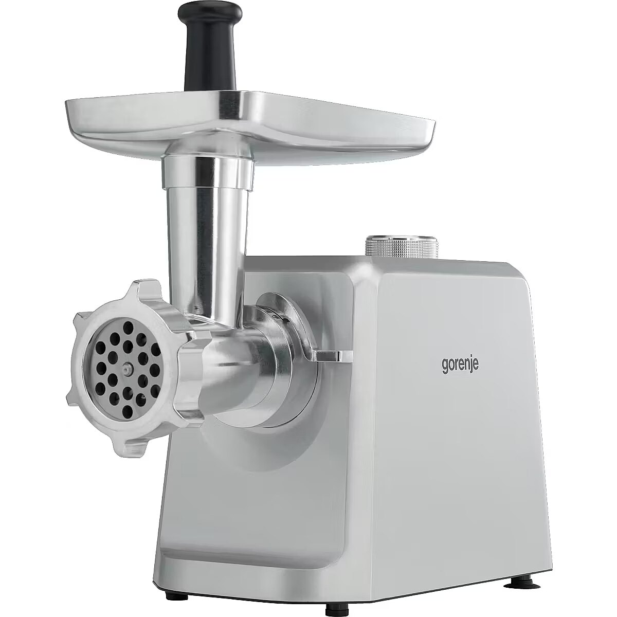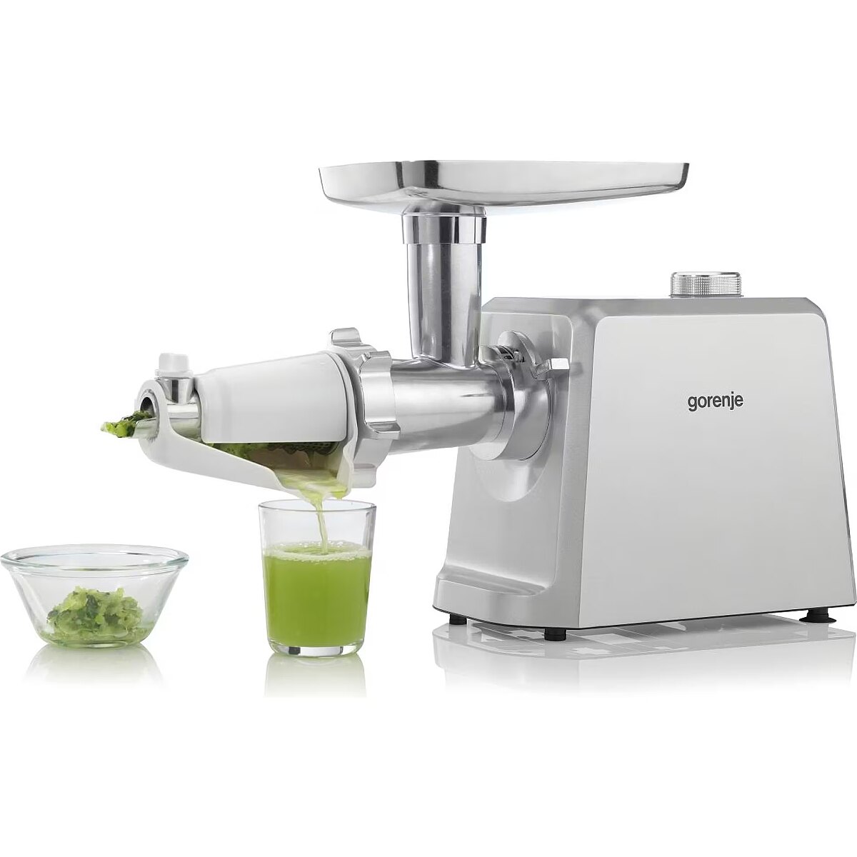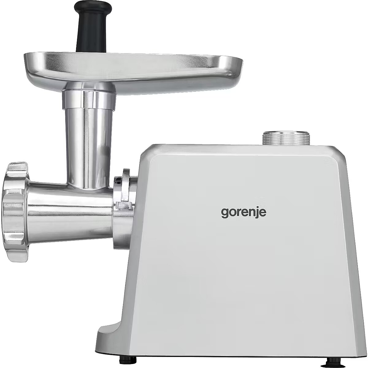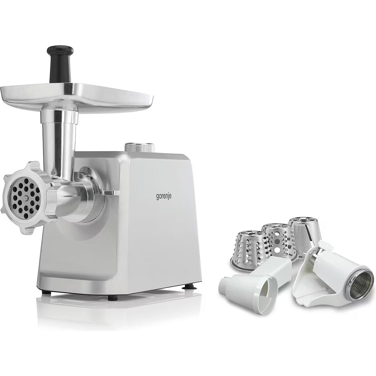 LongDesc - Three grinding platesFinely, medium, or coarsely groundPreparing a variety of minced meat dishes requires different meat structure. Because of possible choice between 3-, 6- and 8-mm grinding plates you can simply adjust the grinding result to your favourite recipe and meat balls, burgers, lasagne, Bolognese, meat pasta or sausages will be just perfect.Sausage stuffing and kubbe kitExplore the tastes of the world’s cuisinesAllow our meat grinder to lead you to explore the wide range of tastes from European, Asian, and Indian cuisines. Making sausages or popular kubbe at home, with known and quality meat is an experience worth trying.Juicer attachmentExtreme extraction and full preservation of nutrientsDue to a double auger system, the extraction of fruit and soft vegetable is super-efficient. At the end of this special double juicing, pulp is separated from juice. As a result, there are fewer air bubbles in the juice, the juice is silkier and juicing temperature is lower which allows the juice to retain more enzymes. Enjoy pure health!Save moneyBuy local, eat quality food, and save the planetIt’s a huge advantage if you buy your food locally. It goes for the meat as well as for all other products. You will know the origin and reach the expected quality of food. There is another advantage – buying large chunks saves a lot of money.Easy to cleanKeeping it simpleMeat grinder is quick and easy to disassemble. Wash all the parts of grinder, shredder, or juicer in soapy warm water. You can use soft brush to remove any residues. Dry and store or reassemble. For longer use, put a little vegetable oil on the cutting knife and grinding plates.Reverse switchJamming resolved in no timeThe grinder comes with a reverse switch designed to help you in case of jamming. The reverse function is a real time-saver if you are trying to grind meat with lots of connective tissue.Healthy.Made at Home.Buy local, eat quality food, and save the planetWith growing consciousness about our food and growing interest in food origin you will sooner or later need the help of Gorenje appliances. You know exactly what is in your burger and on your plate. For extra peace of mind.SimplicityGorenje meat grinders are exceptionally easy to use. They have many features to provide perfect safety. They are easy to operate. You can disassemble, clean, dry and reassemble them in no time. They are compact in design for easy storage.Three different XXL conesInfinite possibilities of slicing and shreddingThree different XXL cones are supplied – for thick slicing, shredding, and grinding. The size of the cones guarantee ideal slicing performance with no clogging. The cones are suitable for both large and small diameter fruits and vegetables. Use slicing blade to cut cucumbers, celery or zucchini; coarse shredder to grate cheese, carrots and any other veggies and fine shredder to shred nuts, chocalate or pizza fillings. No task will be too hard! After use simply wash them under running water.