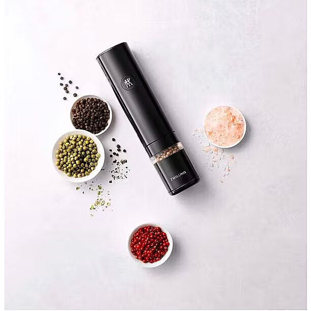 Description - Enfinigy spice grinder Time for a meal? The grinder in hand! The ZWILLING ENFINIGY electric spice grinder in white colour version allows you to efficiently grind pepper, salt and any other aromatic spices. Equipped with ZWILLING ceramic blades, it can handle any grain. Why ceramic? Because it is characterised by an extremely high hardness and abrasion resistance, and allows the full aromatic bouquet of spices to be released during grinding. Thanks to the freely adjustable degree of grinding, you have influence over the thickness of the grain at all times, being free to adapt it to your favourite dishes. The necessary power is provided to the grinder by an efficient, powerful motor powered by a lithium-ion battery which, thanks to its high capacity, does not need frequent recharging. The integrated window allows you to keep a constant check on the filling of the appliance while adding variety to its design. On the other side of the window is an integrated LED light, each time illuminating the food being seasoned. The ZWILLING ENFINIGY electric spice grinder is thus the perfect combination of practicality, excellent quality and stunning design, the work of an outstanding Milanese design duo: Matteo Thun and Antonio Rodriguez. Timelessness and perfection is something that, thanks to these two, no appliance from the ZWILLING ENFINIGY series will lack. Durable ceramic blades for extracting the full flavour of spices Powerful motor Adjustable grinding level High-capacity lithium-ion battery With convenient glass pane and integrated LED illumination Purist design by Milanese duo: Matteo Thun & Antonio Rodriguez