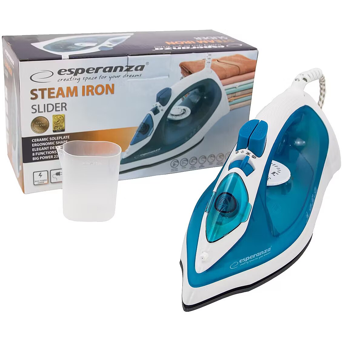 The Esperanza SLIDER steam iron is ideally suited to any household. It is equipped with functions such as steam discharge and protection against dripping when ironing at lower temperatures. The modern ceramic foot does not adhere and is perfectly carried on the material. Uniform heat distribution on the surface of the entire iron base and high power of 2200W will definitely speed up the ironing process. It has a modern, elegant look. Ergonomic shape and lightness will make ironing easy and pleasant.