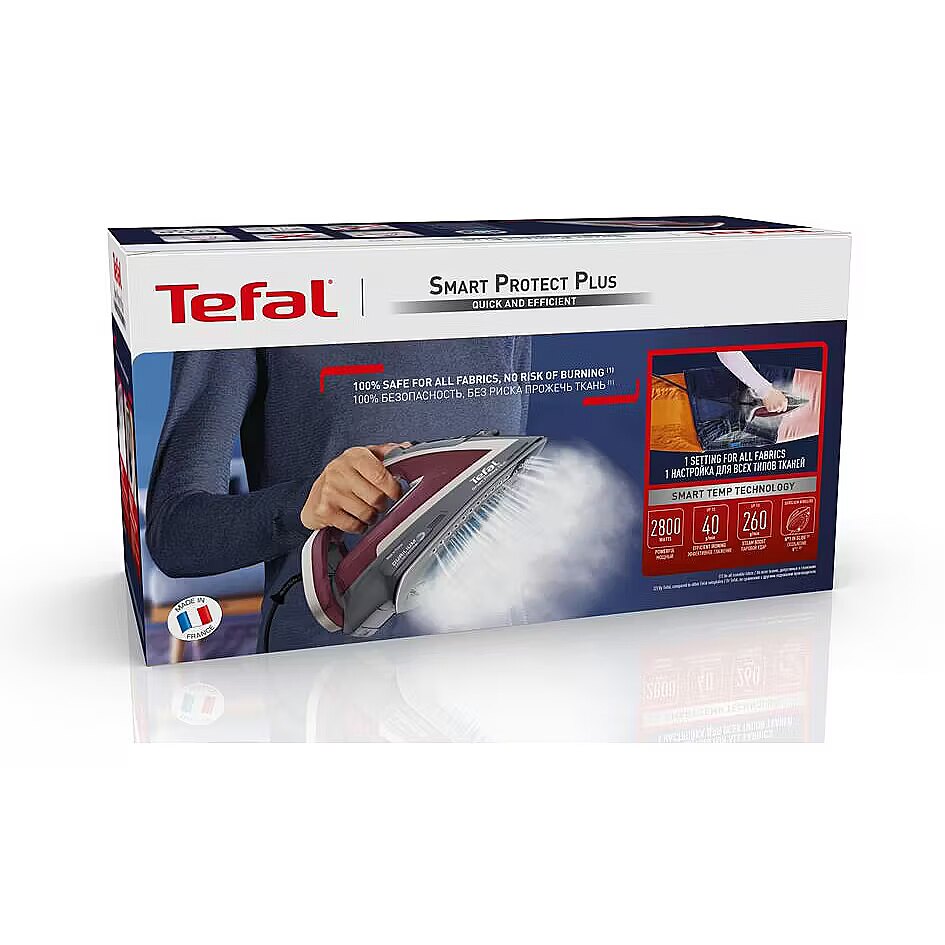 LongDescription EN - Equipped with the Smart Temp Technology, the new Smart Protect Plus provides one perfect combination of temperature and steam for absolute garment protection and worry-free ironing. This simple to use steam iron requires no setting, and provides risk-free ironing results on all ironable fabrics, from tough materials to delicate garments. Ease and protection is matched by performance and very good results. The new Durilium AirGlide® soleplate ensures the best glide* and high-efficiency results, with active steam holes at the tip, sides and even the center of the soleplate for maximum steam distribution. With an anti-drip function to avoid water stain, a smart auto-off function for extra safety, an energy-saving setting that reduces energy use by 20%**. *by Tefal / ** -20% compared with energy consumption at maximum output level.