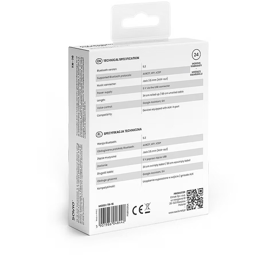 Description - SAVIO TR-16 AUX transmitter with hands-free function Transmitter TR-16 is a multifunctional electronic accessory, which is equipped with Bluetooth 5.3. The chipset used allows you to play music in excellent quality, and the AUX-in connector increases the ways of its use. Importantly, it additionally has support for Google Assistant and Siri services. Easy installation and use The TR-16 transmitter from Savio is a very easy-to-install and use electronic accessory. All you need to do is power it from the USB connector, plug it into your car's AUX jack, pair it with your phone via Bluetooth and you can enjoy your favorite music. The device is ready to use without the need for complicated configuration or installation of additional software. Compatibility Savio transmitter is compatible with most car audio systems that have an AUX input. Thus, even older car models that do not have built-in Bluetooth can enjoy modern wireless functions. Practicality and convenience Savio's TR-16 features convenient handling, with a cable length of 34 cm when retracted and 86 cm when extended. This is especially useful in cars, where the AUX jack can be placed in less accessible places. Also, thanks to the longer cable, the transmitter can be placed closer to the driver or passengers, making it easier to use. Technical specifications: Bluetooth version: 5.3. Bluetooth protocols supported: AVRCP, HFP, A2DP. Music connector: mini Jack 3.5 mm (AUX-out). Power supply: 5 volts via USB connector. Cable length: 34 cm coiled cable / 86 cm extended cable. Voice support: Google Assistant, Siri. Compatibility: devices equipped with AUX input/jack Frequency bands in which the radio equipment operates: Bluetooth: 2400 2483.5 MHz Maximum radio-frequency power transmitted in the frequency band in which the radio equipment operates: Bluetooth: 4 dBm