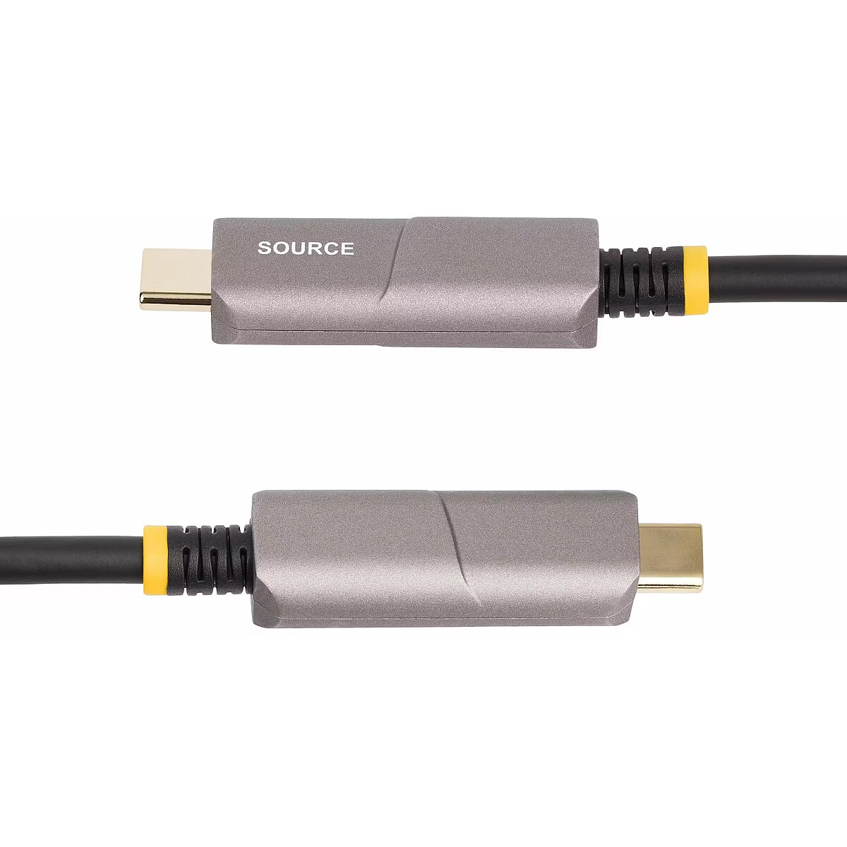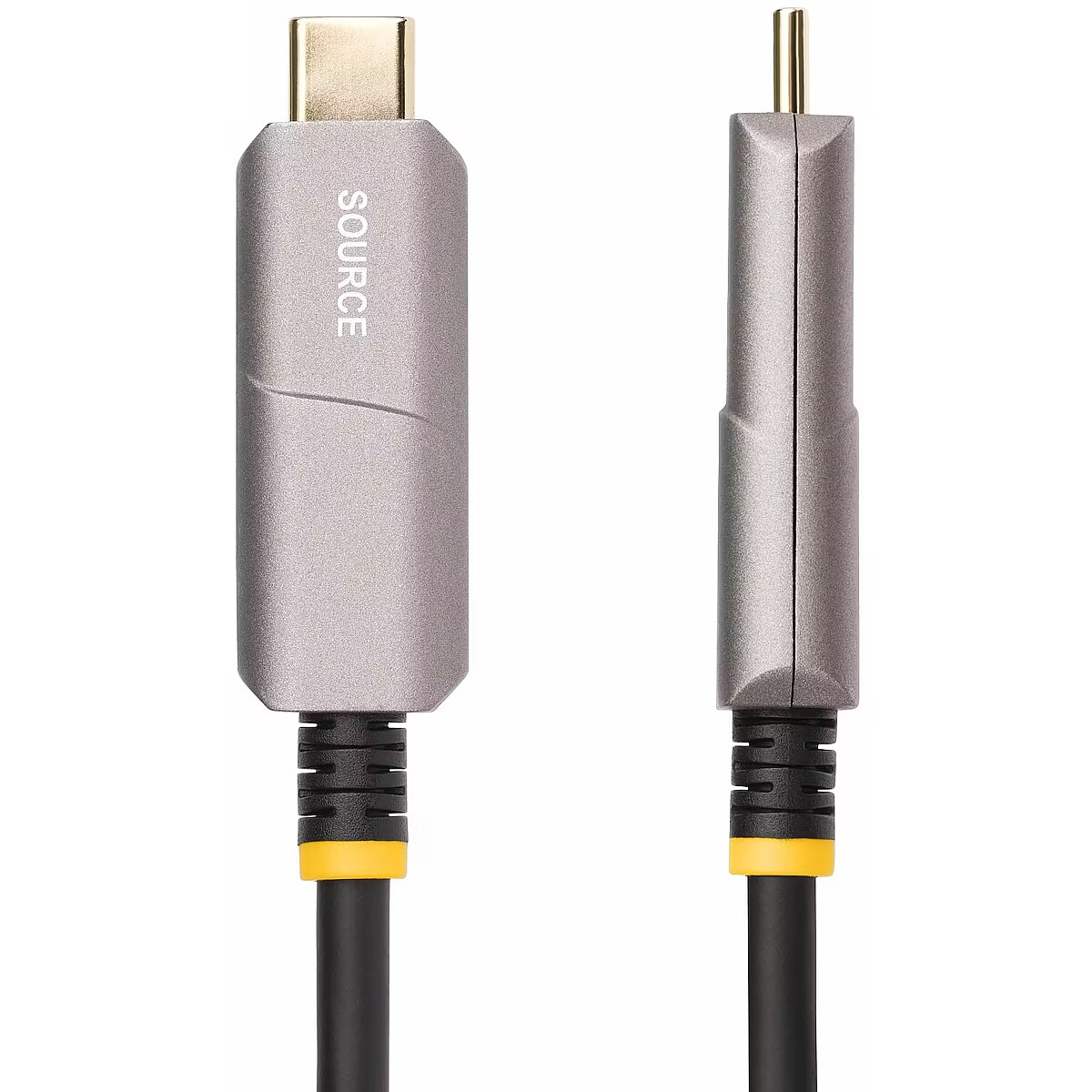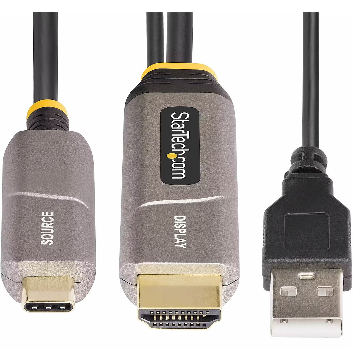 LongDesc - Connect a USB-C video source to an HDMI display, with support for HDR videoConnect a 4K 60Hz HDMI display to a DP Alt Mode-enabled USB Type-C source up to 50 feet (15.2 meters) away with this USB-C to HDMI Active Optical Cable.Designed for Long RangeThe USB-C to HDMI Active Optical Cable is designed for long-distance connections to overcome the limitations of standard copper cables. Its fiber optic inner core reduces electromagnetic interference (EMI), ensuring optimal signal quality with minimal signal degradation. EMI shielding reduces noise and improves signal clarity and stability.Integrated Adapter Cable with HDRThis cable integrates a video adapter and cable, minimizing points of failure and signal loss. The HDMI Connector has a built-in 1.4ft (43.5cm) USB Type-A power cable, which is required to connect to an available USB port or USB wall charger (not included). HDR support includes 8/10bit RGB and YCbCr 4:4:4 for accurate color reproduction.No Drivers or SoftwareUniversal Adapter Cable does not require additional drivers or software installation. Compatible with all hardware platforms and operating systems including Windows, macOS, ChromeOS, and Linux. This USB Type-C to HDMI Adapter Cable works with laptops and devices that support USB-C DP Alt Mode, USB4, Thunderbolt 3, and Thunderbolt 4.Durable Optical CableThe OM3 multi-mode HDMI fiber optic cable features a durable PVC jacket, strain relief, and active booster for reliable transmission over long distances. This cable is lightweight, making it easy to route through walls or cable runs, store when not in use, and transport when needed.The StarTech.com Advantage