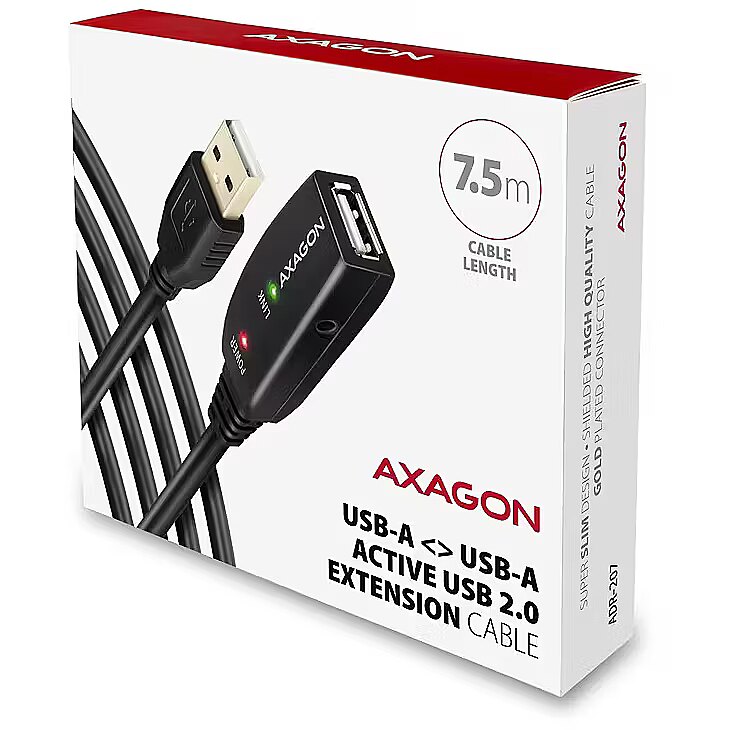 Description - The AXAGON ADR-207 active USB 2.0 extension cable with a length of 7.5 meters is ideal for connecting your computer to USB devices such as a mouse, keyboard, webcam, printer, scanner, plotter, and others. The active USB repeater cable amplifies the transmitted signal and allows you to connect a USB device at a significantly greater distance than a passive cable would allow. The cable's range can be further extended by connecting several cables in sequence. A great advantage of the ADR-207 cable is the integrated connector for additional power supply. In most cases, power via the USB bus is sufficient, but for devices with higher power consumption, USB power may be insufficient over longer distances, and an external power supply from the mains can solve this problem. The exceptionally compact body of the repeater cable allows trouble-free use in electrical installation ducts or cable systems. The use of a high-quality shielded cable ensures high communication speed and minimal unwanted interference. Input: USB 2.0 for connection to a computer USB Type A (M) male connector Output: USB 2.0 for connecting a remote USB device USB Type A (F) female connector  transmission rate 480 / 12 / 1.5 Mbit/s (high / full / low speed) Power supply: Power supply of the cable and connected devices via USB bus (bus-power mode 5V - 500mA). For most connected USB devices, the power supply via USB bus is sufficient and no auxiliary power is required. The active part of the cable includes a connector ( 3.5 x 1.3 mm outer x internal diameter) for additional external power supply of 5V/ 1-2 A. The power cable USB A-M / 3.5 mm jack, 1.2 m long is included. The cable allows powering from a standard mobile phone charger with USB-A output 5V / min. 1A, e.g. AXAGON ACU-QC18.  When powering the repeater cable with the power adapter, an external 2.5" disk can be connected without the need for own power supply to the disk. For longer USB route with multiple repeater cables connected in a row, the USB bus supply may be inadequate for USB devices with lower power consumption than an external 2.5" drive. Also, in this case it can help to boost the power supply by connecting a power adapter. Other features: Fully compatible with USB 2.0 and backward compatible with USB 1.1.  Full Plug and Play and Hot Plug support.  Two LEDs indicating power and USB connection.  Behind the active USB cable, a common passive USB cable can also be used. Supported OS:  MS Windows XP / Vista / 7 / 8 / 8.1 / 10 / 11 and later, macOS, Linux, Chrome OS and Android. Windows Server 2003 / 2008 / 2012 / 2016 / 2019 / 2022 / 2025 and later (all 32- and 64-bit Windows versions supported). Note: Drivers are included with supported operating systems and will be installed automatically. No other drivers need to be installed and are not even available. Package contains: USB 2.0 A-M > A-F active repeater 7.5 m long, USB-A / 3.5 mm power cable, printed installation manual in CZ / DE / DK / ENG / ESP / EST / FIN / FR / GR / HR / HU / IT / LT / LV / NL / NOR / PL / PT / RO / SK / SLO / SRB / SWE / TR / UA / ALB / BG / BOS / CN / ARA, packed in a cardboard box.