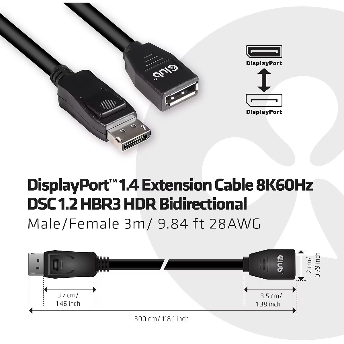 LongDesc - The Club 3D DisplayPort™ 1.4 Extension Cable 8K60Hz DSC 1.2 HBR3 HDR Bidirectional Male/Female 3m/ 9.84ft 28AWG Cable enables the extension of your connection to your DisplayPort™ supported (Gaming) PC or Laptop to an (Ultra) High Resolution Monitor or other DisplayPort™ supported device. DisplayPort™ 1.4 adds support for Display Stream Compression 1.2 (DSC), Forward Error Correction, and extends the maximum number of inline audio channels to 32.It features locking DisplayPort™ connectors providing a secure, dependable connection. Simply press the built-in one-touch latch button to unlock the connector.The soft UltraFlex jacket protects the cable from bends and deformation damage. The Cable is 28AWG and fully Bi-Directional.