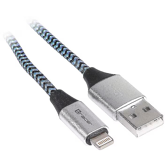 Description - Cable USB 2.0 iPhone AM lightning 1,0m black-blue Modern braided cable with a universal Lightning tip. It fits for iPhones and iPads and will satisfy every fan of devices with the logo of bitten apple. The cable can be connected to a charger with a USB port, computer, netbook or other energy source. Original product of the TRACER brand - a reliable supplier of consumer electronics and GSM accessories
