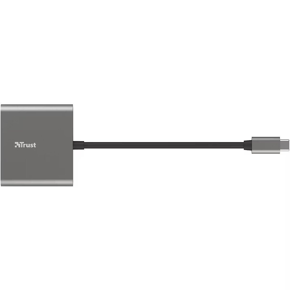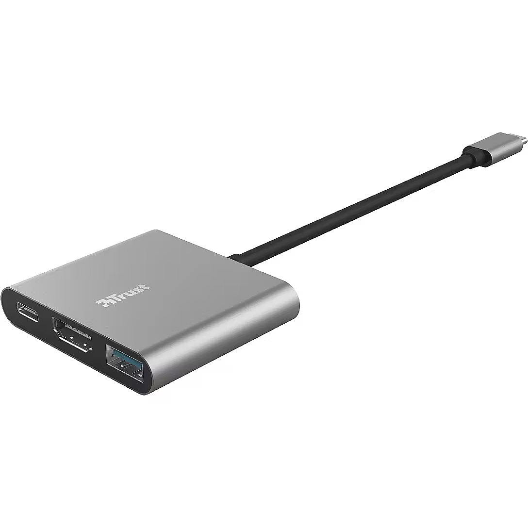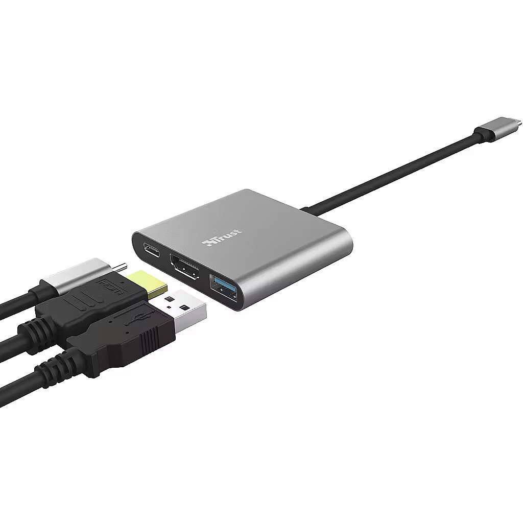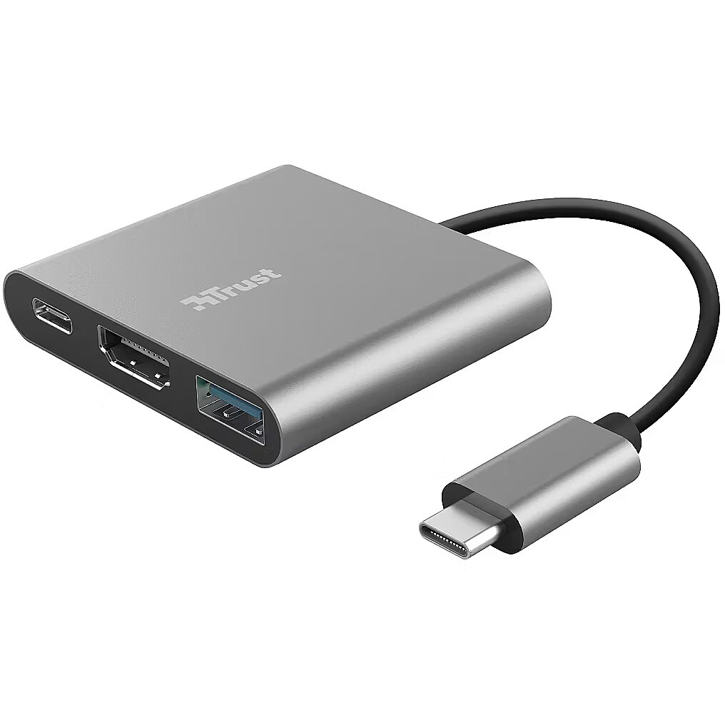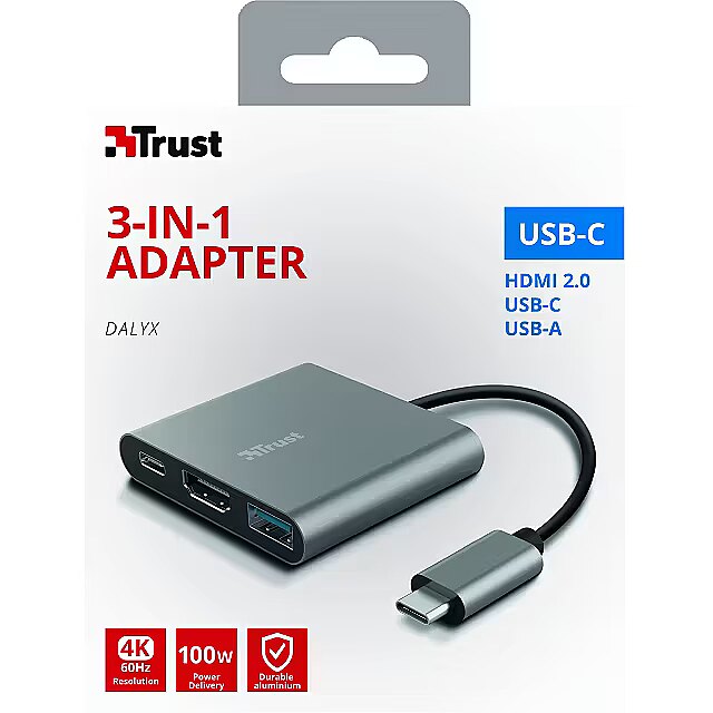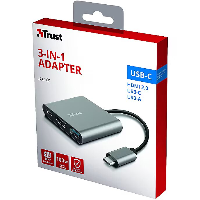 LongDesc - Upgrade Your WorkflowWith the Trust Dalyx 3-in-1 Multiport USB-C Adapter you can really get the most out of your laptop. Extend the number of ports on your laptop and connect with multiple devices through an HDMI, a USB-A and a USB-C charge port.Easy Setup And CompatibilityThe versatile Trust Dalyx 3-in-1 Multiport USB-C Adapter works with every laptop, MacBook and tablet* that has a USB-C port. The Dalyx allows you to transfer data extra-fast over the USB-A port, at a speed of up to 5 Gbps via USB 3.2 Gen 1. There’s no need to install software for this handy tool; just plug in & play! *Compatibility with Android tablets may vary, depending on USB-C implementationBroad ConnectivityUsing a single USB-C port on your device, the Dalyx offers all-round connectivity. Connect your tablet or laptop to a monitor or TV through the HDMI port to watch films and view photos in ultra-high resolution and rich colours thanks to HDMI 1.4 (4k30Hz). Charge your laptop via the USB-C PD (Power Delivery) port and add other devices like your keyboard or an external drive using the USB-A port.Stylish Office and Travel EssentialThe adapter comes in a durable die-cast aluminium alloy housing, making for a stylish addition to your desk setup and work kit, whilst its compact design makes it perfect for travelling. If you need to connect with various devices away from home, the Dalyx is your go-to office and travel essential.