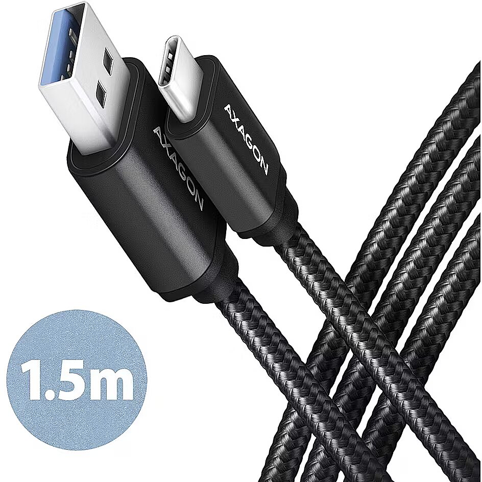 LongDesc - Premium connection USB-C USB-A Data and Charging AXAGON BUCM3-AM15AB SPEED USB 3.2 Gen 1 cable with USB-C male and USB-A male connectors. The cable is designed for fast data transfers and notebook, phone, tablet and other mobile device charging. It supports up to 5 Gb/s data transfer and charging with current up to 3A. Durable data and power cable with extended service life is equipped with metal terminals, connectors with a nickel-plated surface and gold-plated contacts. Cable conductors are made of Tin-plated oxygen free copper. High-quality cable insulation, made of flexible TPE, guarantees maximum durability and also maintains sufficient flexibility. The final strength of the cable is provided by the nylon braid. The bonus is a practical strip for easy packing of the cable.Power cables 22AWG (lower number = larger cross-section and lower wire resistance) guarantee fast charging of phones and other mobile devices. Data wires 30AWG together with high-quality shielding, ensure reliable data transmission. Triple shielding protects transmitted signals from adverse interference.Nylon braid in combination with a cable gland significantly reduces dangerous cable bending. The cable life is extended to more than 8000 standard bends. The mechanical resistance of the cable is also increased by the aluminum terminal covers.Connectors:• USB-C (M) male • USB-A (M) male Other Features:• DATA SYNC & FAST CHARGING - simultaneous data transfer and mobile device battery charging.• SuperSpeed USB - USB 3.2 Gen 1 (formerly USB 3.1 Gen 1 / USB 3.0).• Compatible with USB 3.2 Gen 2, backward compatible with USB 2.0.• Supports 5.000 / 480 / 12 / 1.5 Mb/s (SuperSpeed / High / Full / Low speed) transmission rates.• Support for high-speed charging by current up to 3A.• Supported charging technologies: Qualcomm Quick Charge 2.0 / 3.0, Samsung Adaptive Fast Charging, Huawei Fast Charge Protocol, SMART Charging and others.• Cable includes power wires 22AWG, data wires 30AWG.• Tin-plated oxygen free copper conductors to reduce oxidation, increase conductivity, and clear signal without distortion.• Double shielding via galvanized foil and oxygen free copper braiding minimizes interference and prevents signal loss.• Nickel-plated connectors and gold-plated contacts prevent oxidation and provide a reliable connection.• Suitable for mobile phones and smartphones, tablets, powerbanks and other mobile devices with USB-C connector.Other data:• cable length 1.5 m,• 4.5 mm outer diameter.Package contains:• USB-C M USB-A M black cable,• tightening strip,• packed in a printed and sealed foil package with hanging hole.